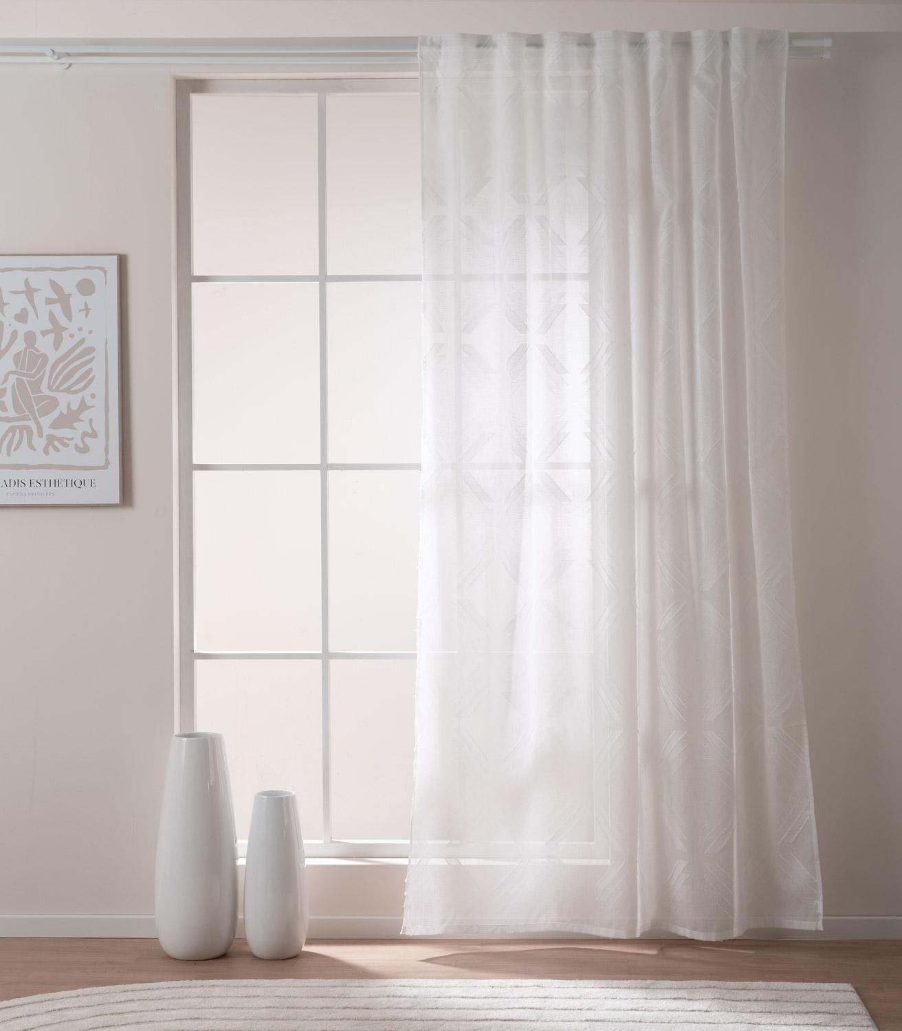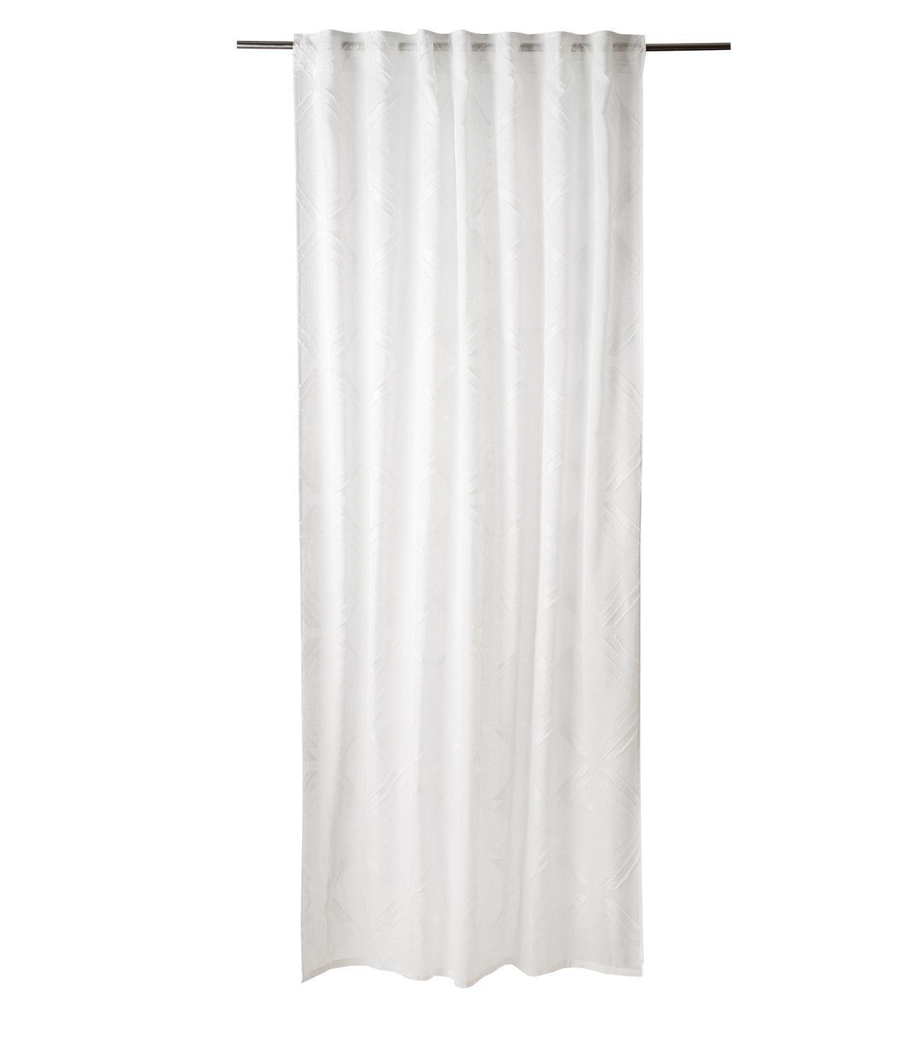 Der weiße Schlaufenschal von Home4You bringt stilvolle Leichtigkeit ans Fenster. Mit seinen 140 x 245 cm fällt er weich und lässt durch den halbtransparenten Stoff viel Tageslicht in den Raum. Die dezente Leinenstruktur mit feinem Rautenmuster verleiht dem unifarbenen Design einen modernen Charakter. Verdeckte Schlaufen schaffen ein ruhiges Gesamtbild an der Stange. Der Polyesterstoff ist pflegeleicht, bei 60 °C waschbar und bügelgeeignet – ideal für helle Wohnbereiche.