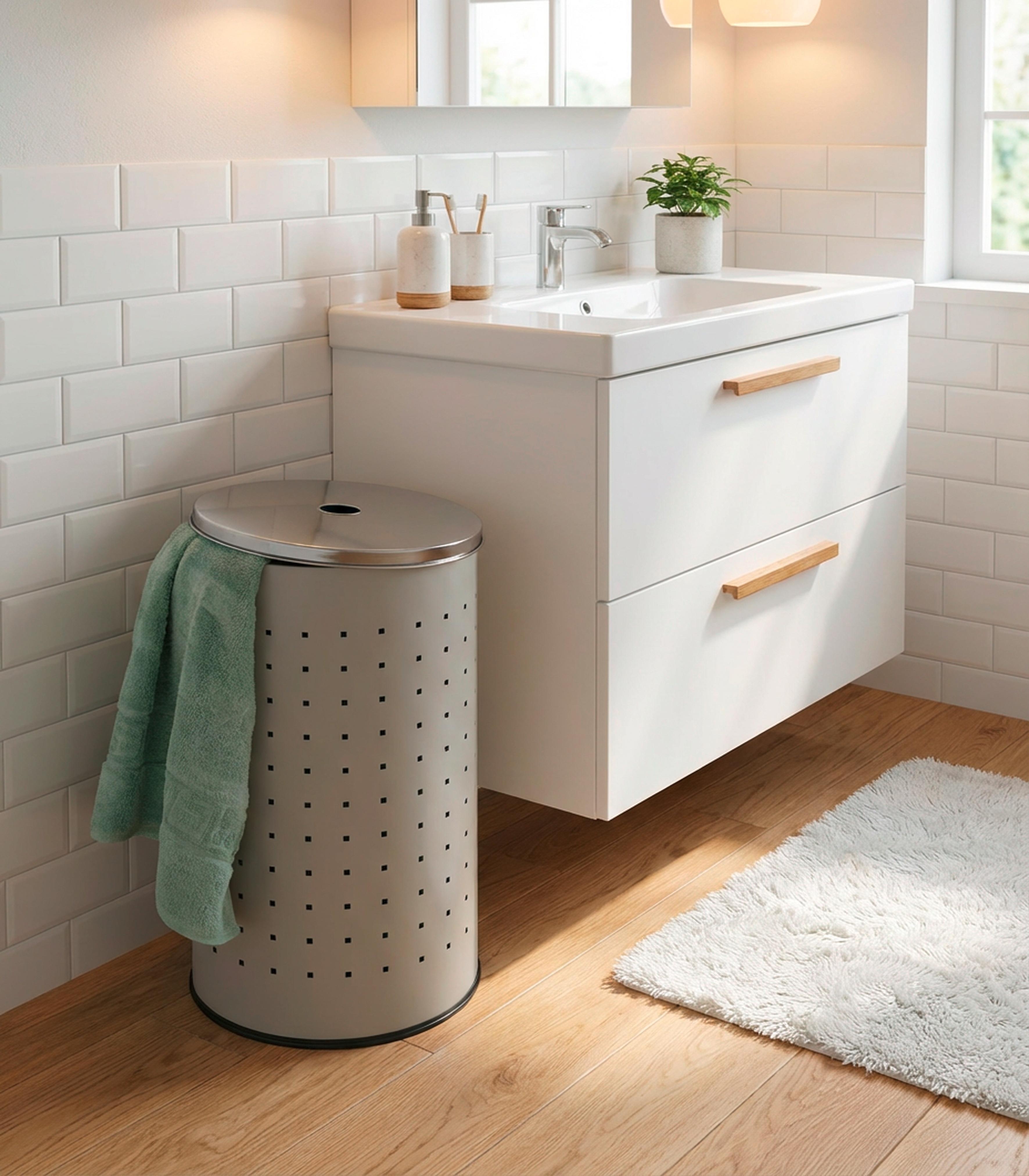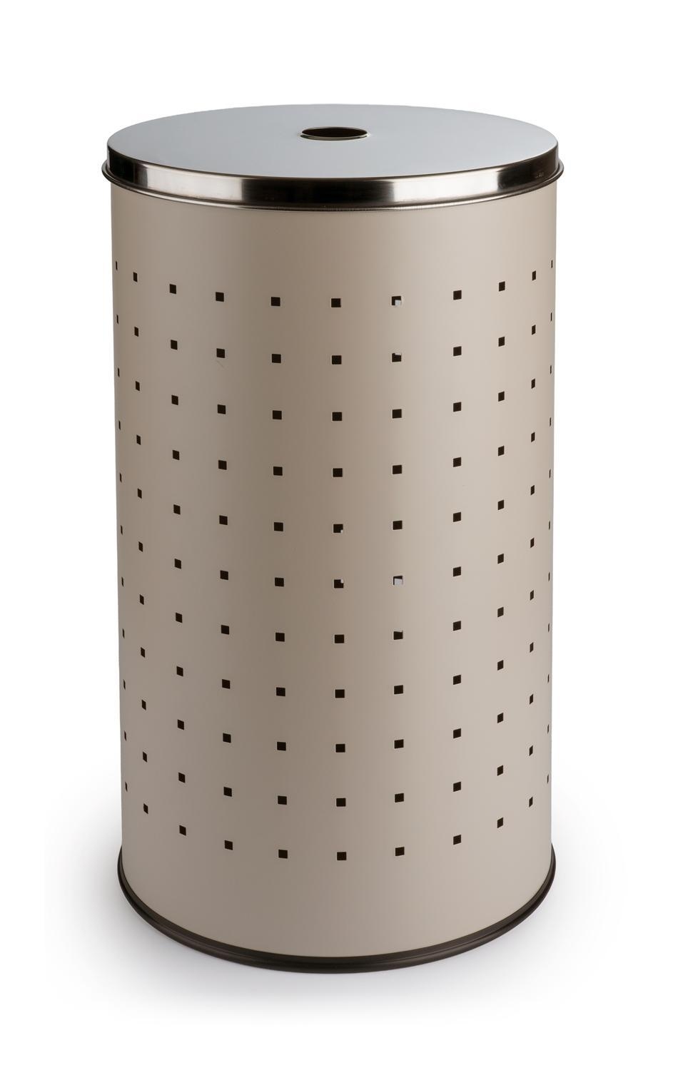 Hier kommt die Wäschetonne aus Edelstahl in Greige, welches der Tonne ein elegantes Design verleiht. Da die meisten Badezimmer in Greige gehalten sind, fügt sich der Wäschesammler mit seiner grauen Lackierung ideal in jede Badeinrichtung ein. Mit dem Deckel sorgen Sie dafür, dass das Chaos im Wäschekorb nicht sichtbar ist. Dieser lässt sich dank des cleveren Lochs in der Mitte einfach anheben. Großzügige Maße von 54 cm Höhe und einem Durchmesser von 29 cm bieten rund 37 Liter Fassungsvermögen. So verstauen Sie Ihre ganze Wäsche einfach und schnell. Diese edle Wäschetonne ist nicht nur ein Hingucker im Bad, sondern macht sich ebenso gut im Schlafzimmer, Ankleideraum oder der Waschküche.