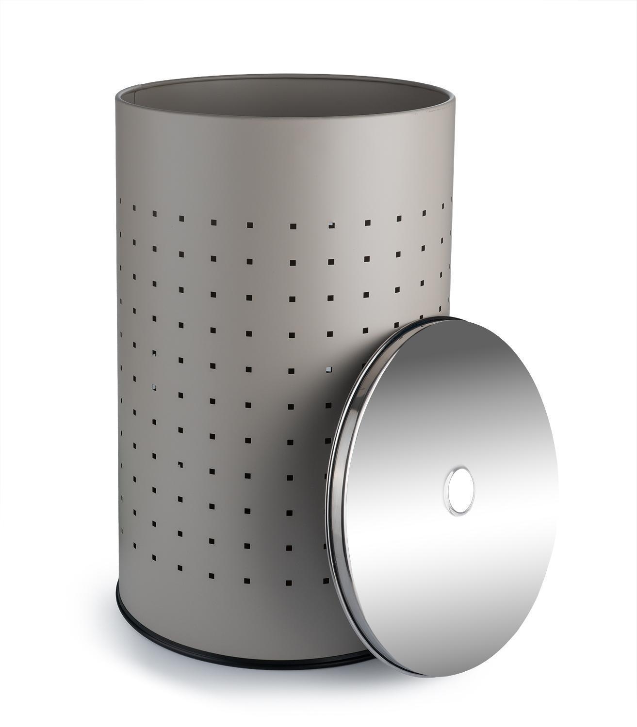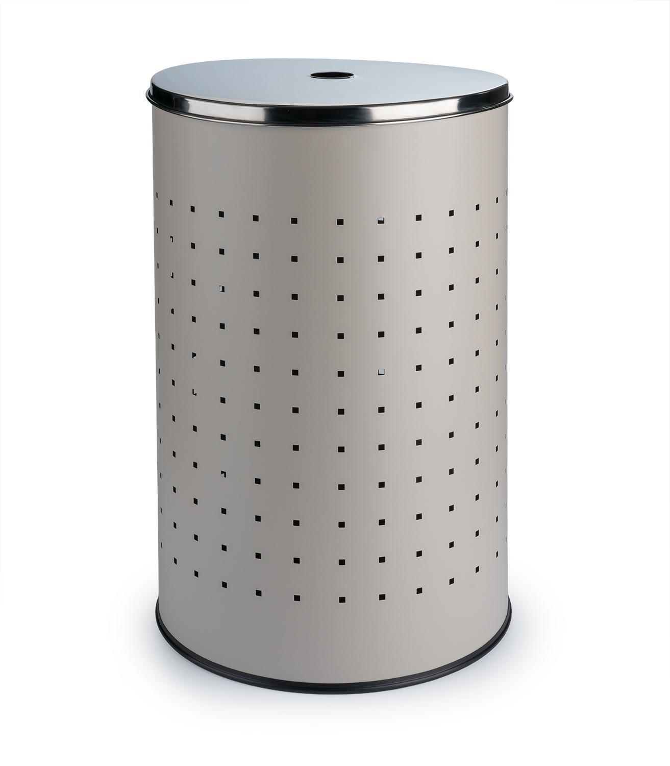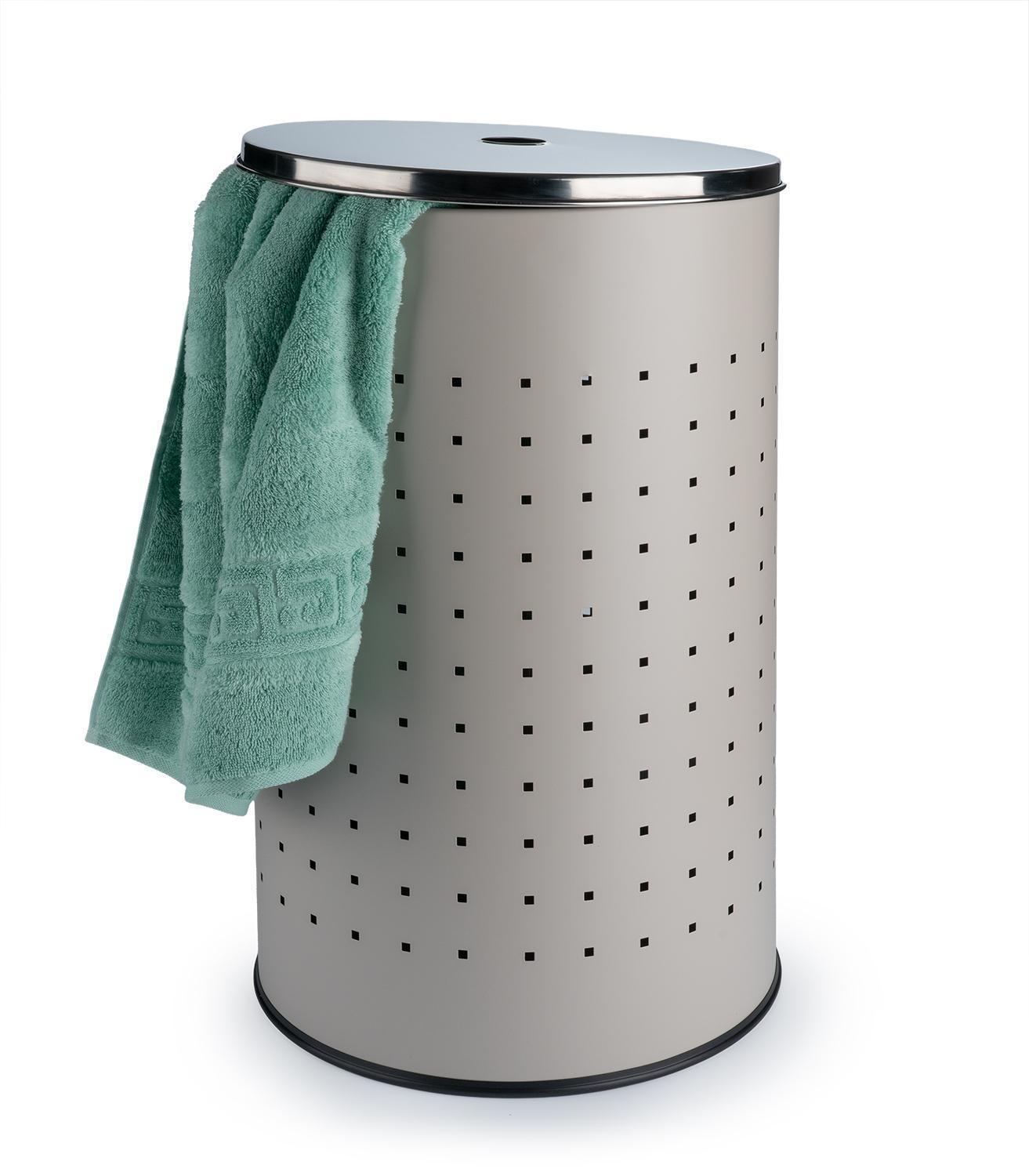 Hier kommt die Wäschetonne aus Edelstahl in Grau, welches der Tonne ein elegantes Design verleiht. Da die meisten Badezimmer in Greige gehalten sind, fügt sich der Wäschesammler mit seiner grauen Lackierung ideal in jede Badeinrichtung ein. Mit dem Deckel sorgen Sie dafür, dass das Chaos im Wäschekorb nicht sichtbar ist. Dieser lässt sich dank des cleveren Lochs in der Mitte einfach anheben. Großzügige Maße von 57,5 cm Höhe und einem Durchmesser von 35,5 cm bieten rund 54 Liter Fassungsvermögen. So verstauen Sie Ihre ganze Wäsche einfach und schnell. Diese edle Wäschetonne ist nicht nur ein Hingucker im Bad, sondern macht sich ebenso gut im Schlafzimmer, Ankleideraum oder der Waschküche.