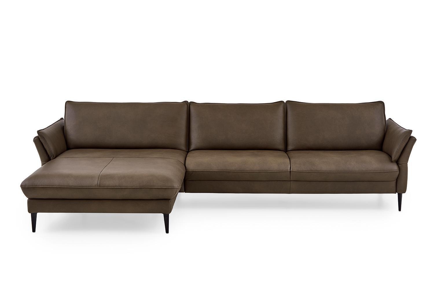 Das Ecksofa PIRAN der Marke HUKLA ist mit einem Lederbezug in Braun ausgestattet und steht auf Füßen aus Aluminium in Schwarz. Die Sitzfläche verfügt über Polstervlies auf einer Federkernpolsterung, während die Rückenfläche mit Polyätherschaum gepolstert ist. Zum Sofa gehören drei Rückenkissen. Die Ottomane ist ausschließlich linksseitig montierbar. Die Maße betragen 306 cm in der Breite, 86 cm in der Höhe und 172 cm in der Tiefe. Die Sitzhöhe liegt bei 46 cm, die Sitztiefe bei 53 cm.