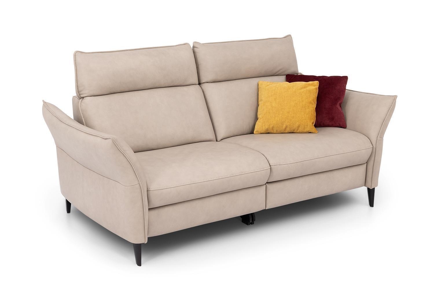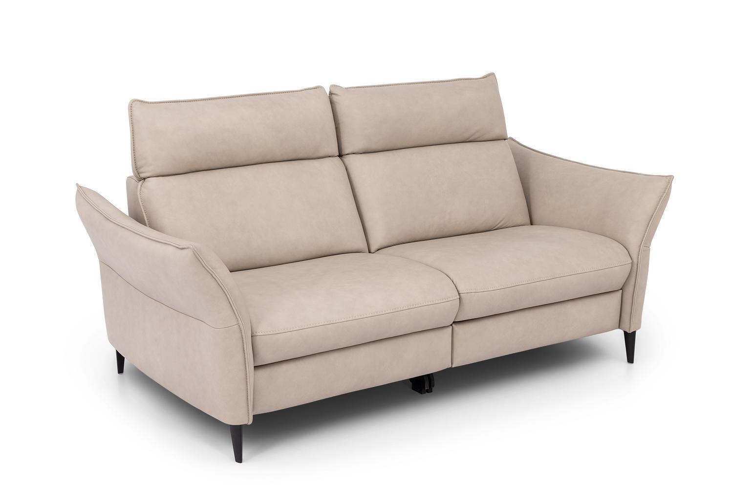 Das Sofa RAMOS als 2-Sitzer der Marke HUKLA ist mit einem Lederbezug in Beige ausgestattet und verfügt über Füße aus Aluminium in Schwarz. Die Sitzfläche besteht aus Kaltschaum auf einer Federkernpolsterung, die Rückenfläche ist ebenfalls mit Kaltschaumpolsterung versehen. Zwei Kopfteilverstellungen ergänzen die Ausstattung. Die Höhe beträgt 98 cm bei eingeklappten Kopfteilen und 112 cm bei ausgeklappten Kopfteilen. Das Sofa misst 166 cm in der Breite und 95 cm in der Tiefe, die Fußhöhe liegt bei 11 cm. Die Sitzhöhe beträgt 45 cm, die Sitztiefe 56 cm.