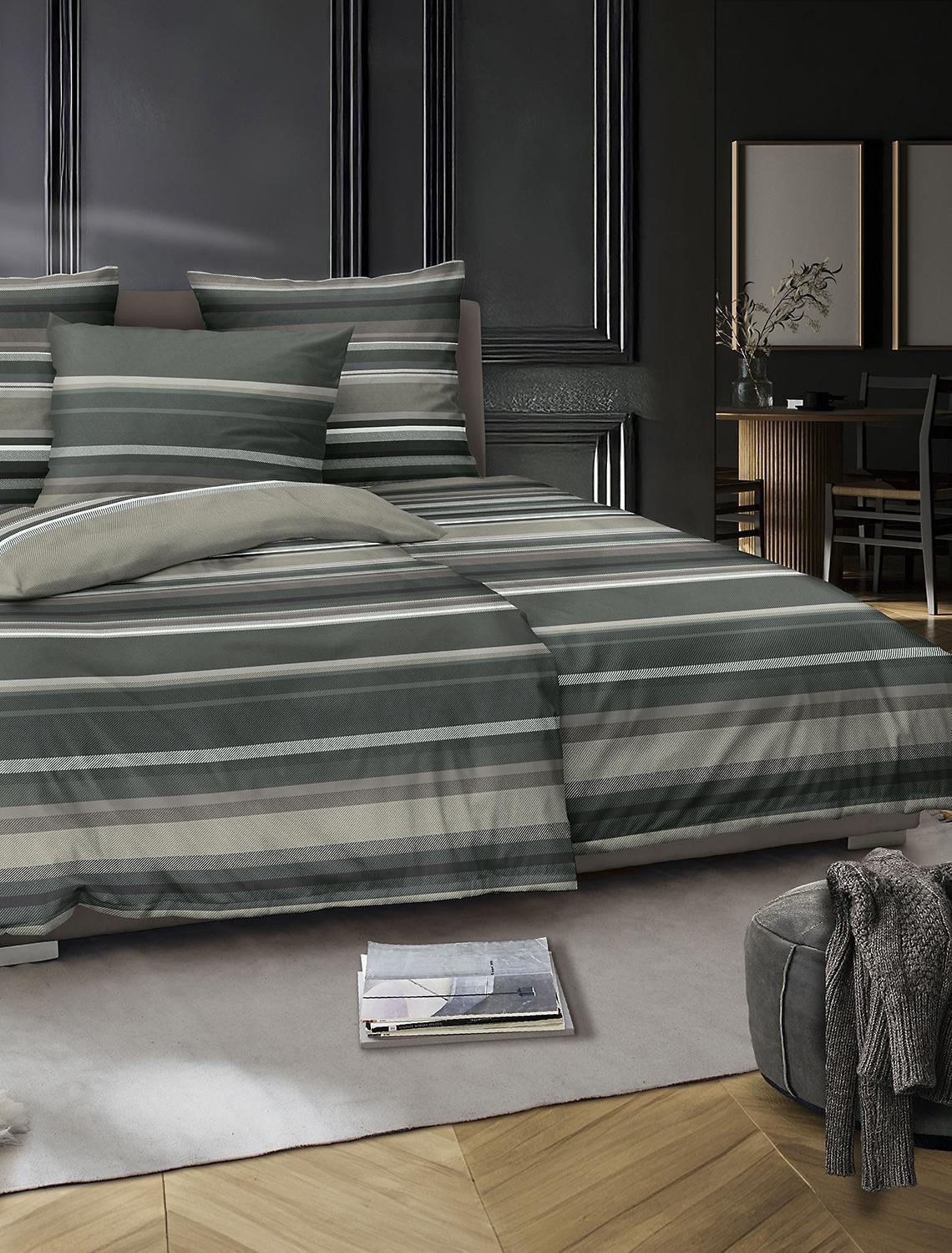 Bettwäsche VAYA in Grün und Grau von Irisette bietet kuschelig weichen Komfort. Aus Baumwolle gefertigt und mit einem stilvollen Blättermuster versehen, sorgt sie für eine gemütliche Atmosphäre im Schlafzimmer. Der Reißverschluss erleichtert das Beziehen und macht die Bettwäsche besonders alltagstauglich.