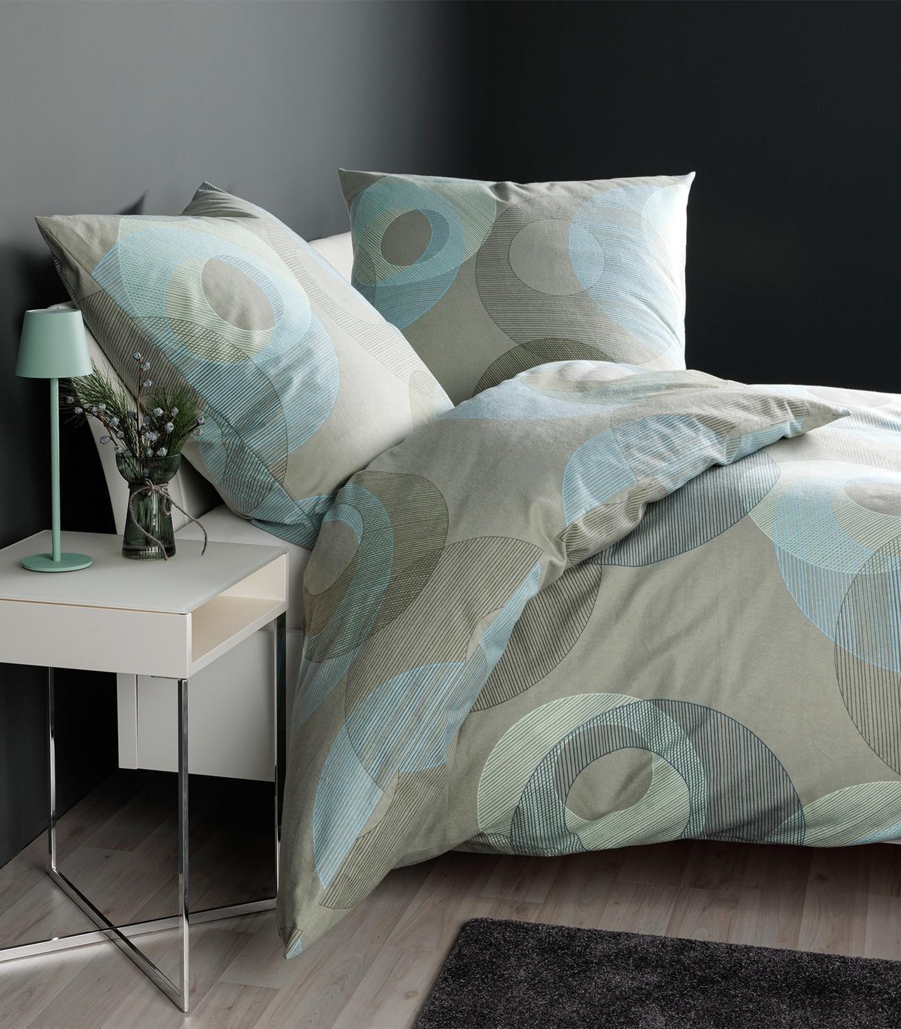 Die Feinbiber-Bettwäsche CANINA von Janine sorgt für gemütliche Nächte und ein stilvolles Schlafzimmer. Gefertigt aus reiner Baumwolle in weicher Feinbiber-Qualität, bietet sie hohen Komfort und Wärme. Die Musterung von grafischen Kreisen in Grau, Blau und Grün auf grauem Grund setzt moderne Akzente. Das Set enthält einen Bettbezug in 135 x 200 cm und einen Kissenbezug in 80 x 80 cm, beide mit praktischem Reißverschluss. Waschbar bei 60 °C und pflegeleicht für hygienische Frische.