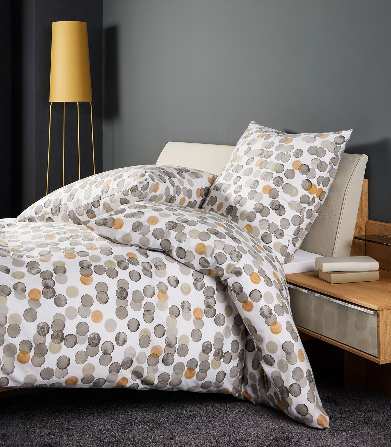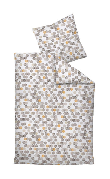 Die Feinbiber-Bettwäsche DAVINA von Janine sorgt für gemütliche Nächte und ein stilvolles Schlafzimmer. Gefertigt aus reiner Baumwolle in weicher Feinbiber-Qualität, bietet sie hohen Komfort und Wärme. Das Aquarellkreise-Muster in Greige und Gelb auf weißem Grund setzt moderne Akzente. Das Set enthält einen Bettbezug in 135 x 200 cm und einen Kissenbezug in 80 x 80 cm, beide mit praktischem Reißverschluss. Waschbar bei 60 °C und pflegeleicht für hygienische Frische.