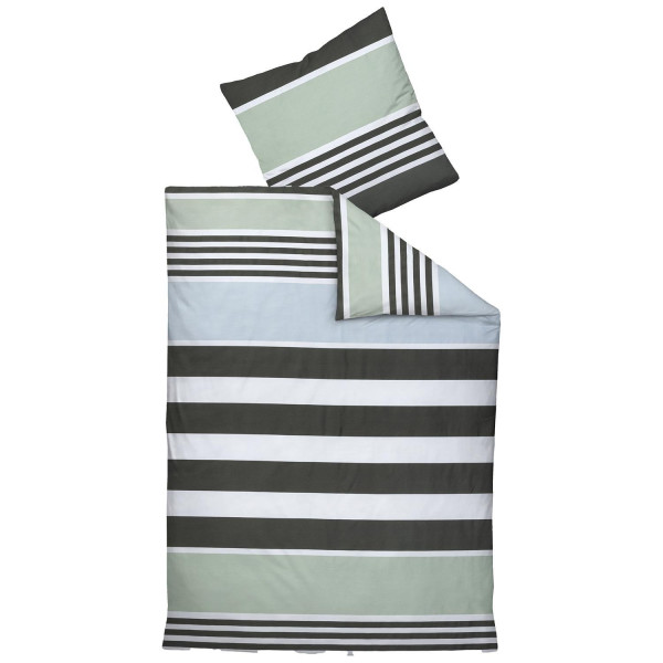 Die Janine Mako-Satin-Bettwäsche IANA präsentiert sich in Weiß, Schwarz und Salbeigrün mit elegantem Streifenmuster. Das Set besteht aus einem Bettbezug in der Größe 135 x 200 cm sowie zwei passenden Kissenbezügen. Aus Baumwolle gefertigt, bietet es eine glatte Oberfläche und angenehmen Schlafkomfort. Die Bettwäsche ist bei 60 °C waschbar, trocknergeeignet und mit einem praktischen Reißverschluss ausgestattet.