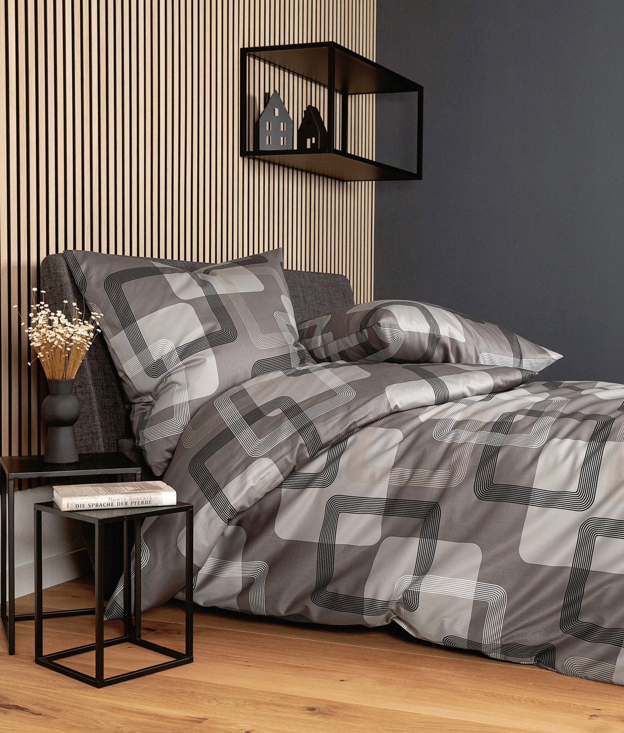 Die Mako-Satin-Bettwäsche MILOU von Janine in Braun und Grau bietet mit 135 x 200 cm ultimativen Komfort. Hergestellt aus 100 % Baumwolle mit grafischem Design, ist sie mit einem Reißverschluss ausgestattet. Eine stilvolle und praktische Ergänzung für jedes Schlafzimmer.