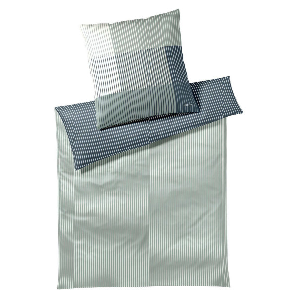 Die Mako-Satin-Wende-Bettwäsche J! GETEILT von JOOP! Überzeugt mit modernem Design und hochwertiger Qualität. Die Vorderseite des Deckenbezugs ist in Salbeigrün- und Weißtönen gestreift, die Rückseite in Blau und Weiß. Der Bettbezug misst 135 x 200 cm und der Kissenbezug 80 x 80 cm. Beide bestehen aus 100 % Baumwolle und verfügen über einen praktischen Reißverschluss. Waschbar bei 60 °C, trocknergeeignet und bügelfreundlich bis 150 °C.