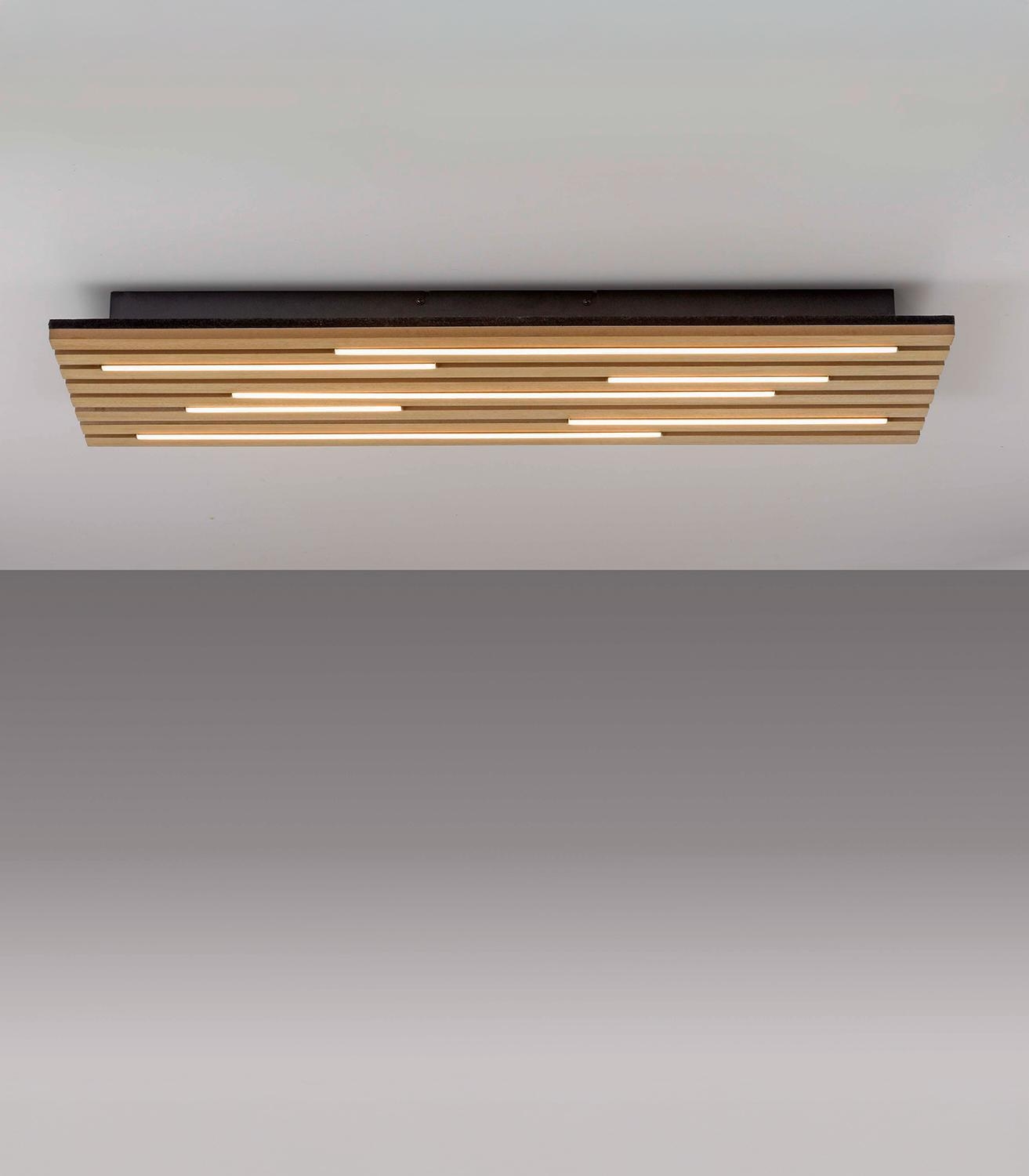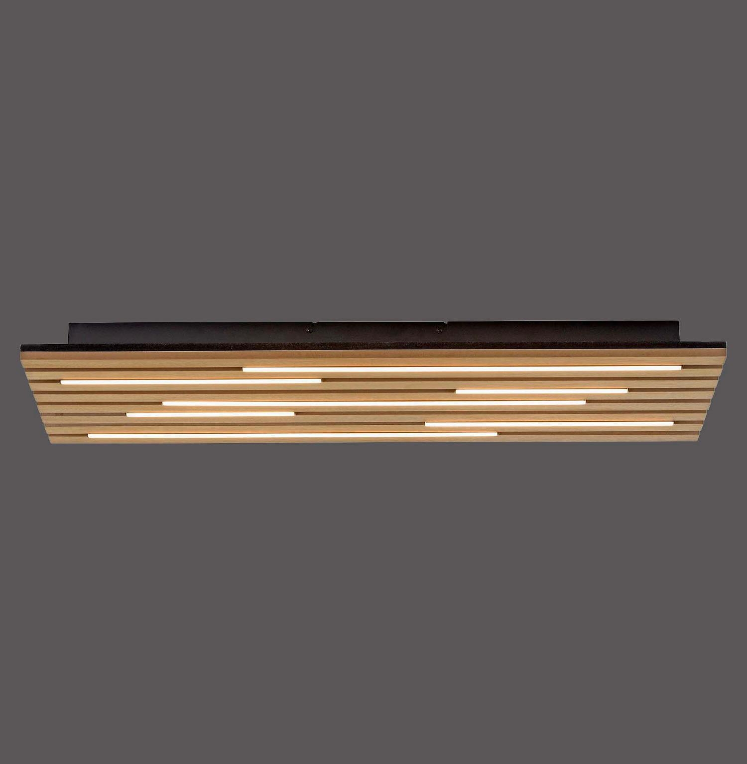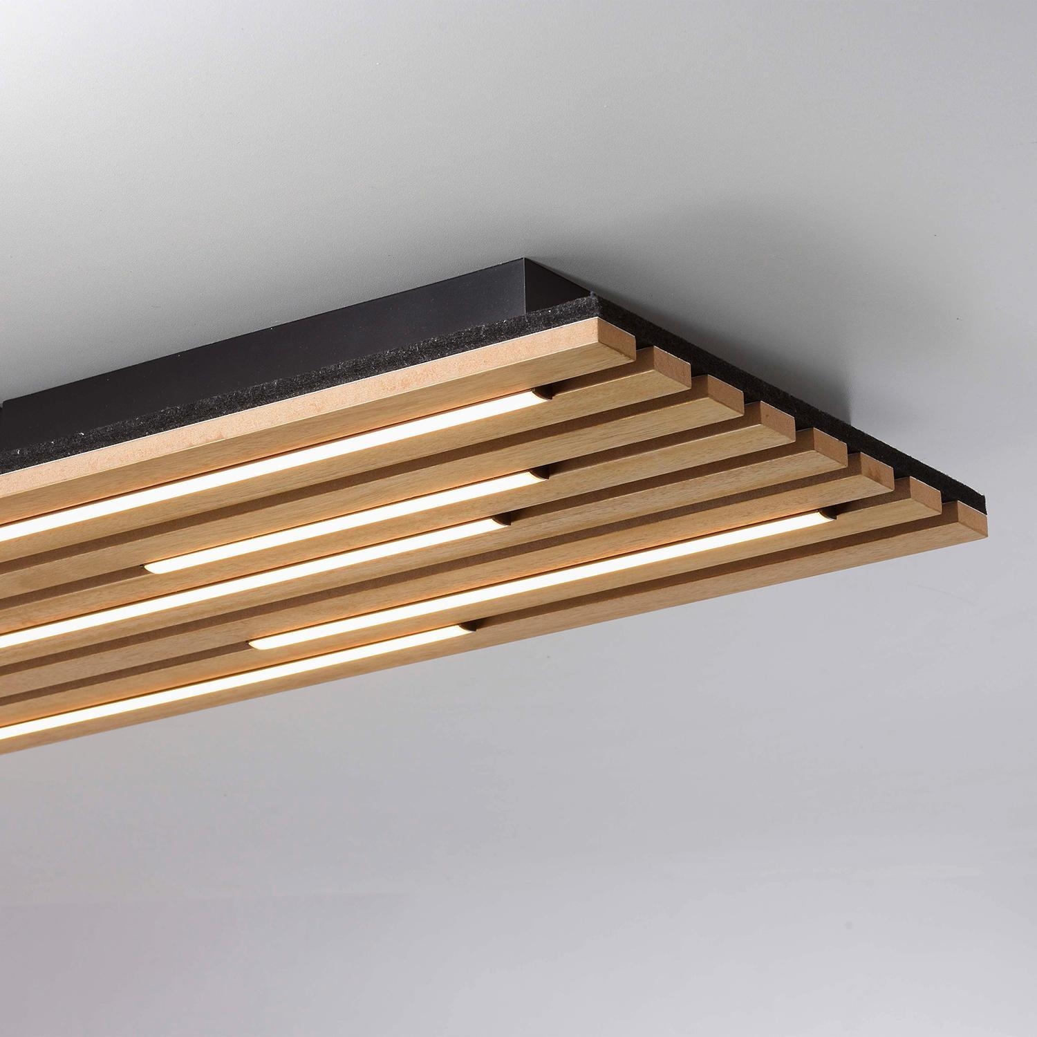 Die LED-Deckenleuchte AKUSTIK der Marke Just Light. besteht aus einem Gestell aus Metall in Schwarz und ist mit einem Lampenschirm aus Echtholzfurnier auf Akustikfilz ausgestattet. Sie misst 80 cm in der Breite, 30 cm in der Tiefe und 5 cm in der Höhe. Integriert ist ein LED-Leuchtmittel, das im Lieferumfang enthalten und nicht austauschbar ist. Es verfügt über eine Leistung von 25 Watt, eine Lichtstärke von 3400 Lumen sowie eine Farbtemperatur von 3000 Kelvin.