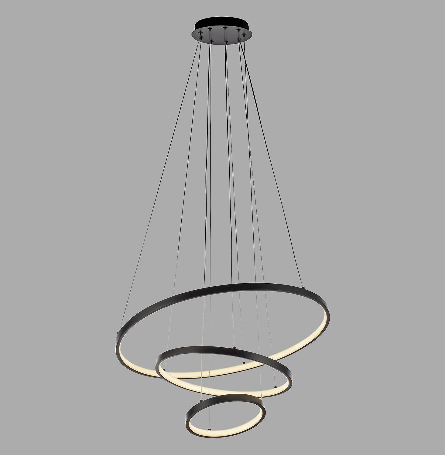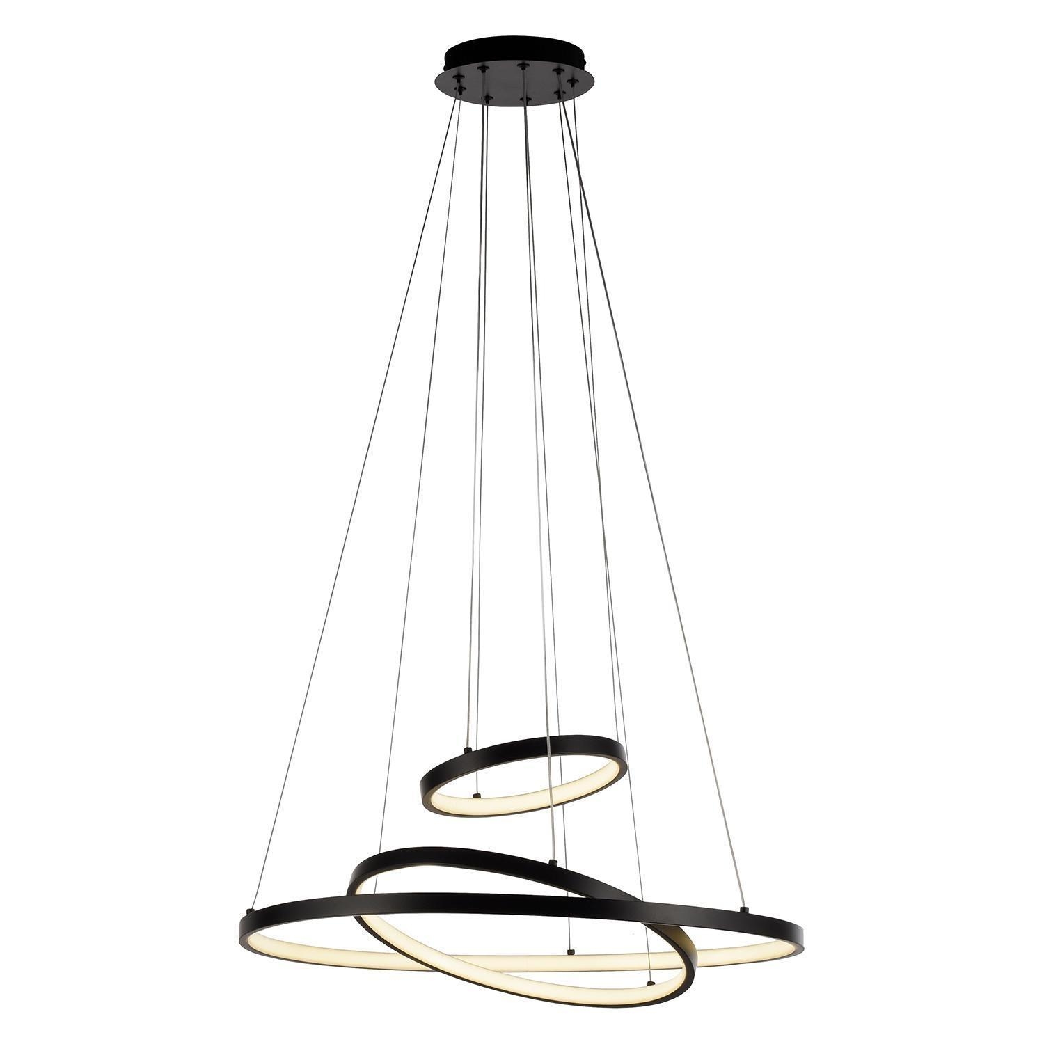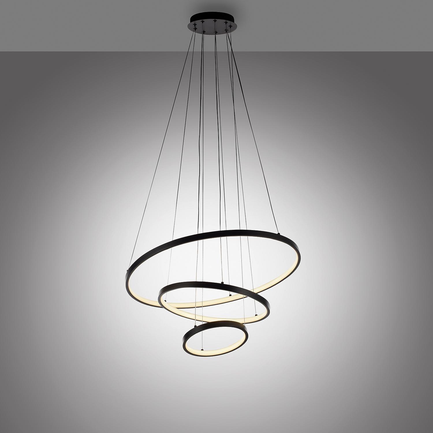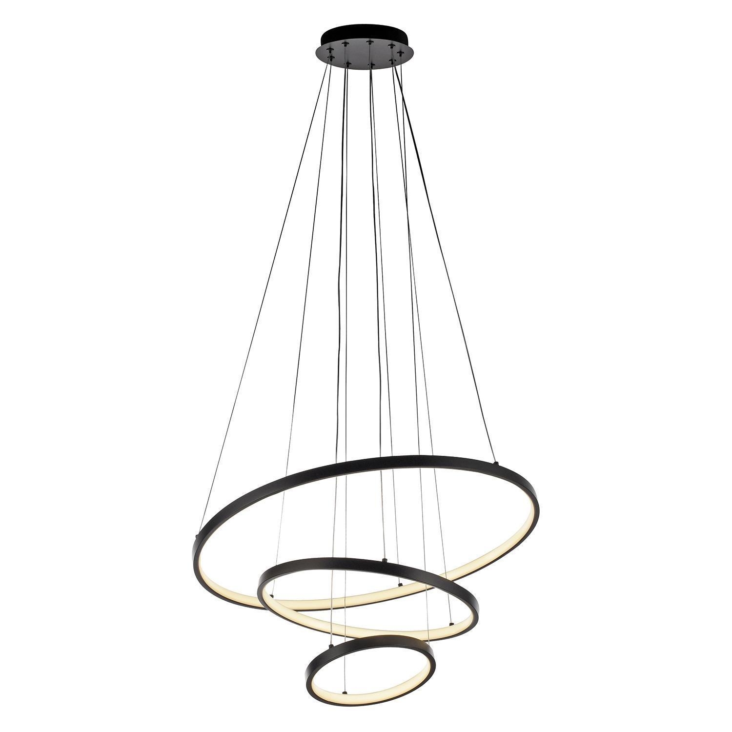 Die LED-Pendelleuchte CERCHI der Marke Just Light. wird aus schwarzem Metall gefertigt. Diese Hängeleuchte weist einen Durchmesser von 61 cm sowie eine Höhe von 150 cm auf. Das fest verbaute LED-Leuchtmittel erbringt eine Leistung von 45 Watt und erzeugt einen Lichtstrom von 5600 Lumen. Mit einer Farbtemperatur von 3000 Kelvin gibt die Leuchte ein warmweißes Licht ab.