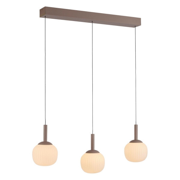 Die LED-Pendelleuchte NAMI der Marke Just Light. besteht aus Metall in Sandbraun und ist mit drei Lampenschirmen aus Glas ausgestattet. Sie hat eine Breite von 81 cm, eine Tiefe von 15 cm und erreicht eine Höhe von 200 cm. Die Leuchte ist mit drei fest verbauten LED-Leuchtmitteln versehen, die im Lieferumfang enthalten sind und nicht ausgetauscht werden können. Die Leistung beträgt 15 Watt, die Farbtemperatur liegt bei 3000 Kelvin und der Lichtstrom bei 1800 Lumen.