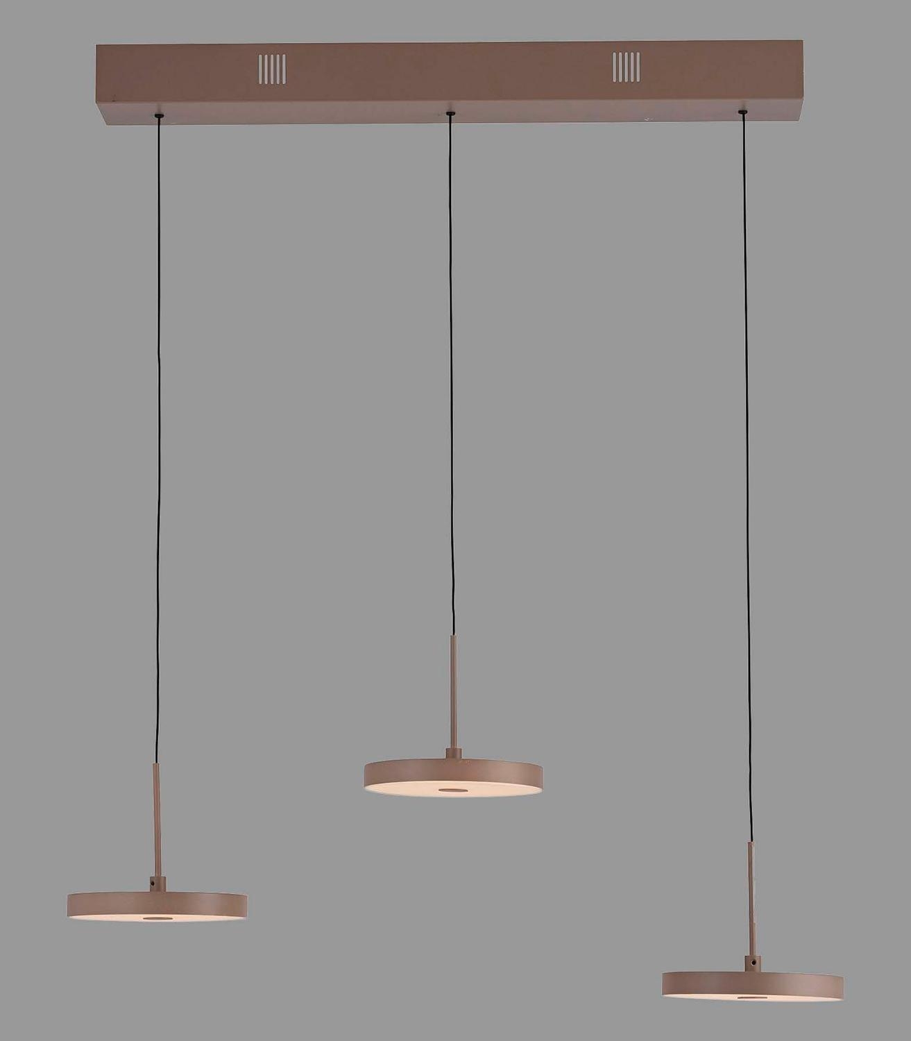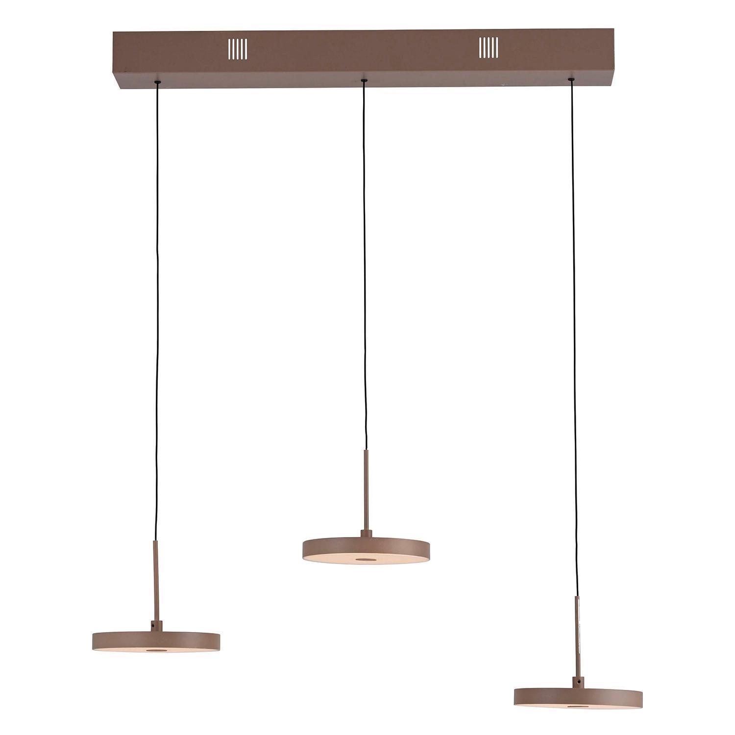 Die LED-Pendelleuchte PLATA der Marke Just Light. ist aus Metall in Sandbraun gefertigt. Sie wird mit drei integrierten LED-Leuchtmitteln geliefert, die eine Leistung von ingsesamt 19,5 Watt erbringen und eine warmweiße Lichtfarbe von 3000 Kelvin erzeugen. Die Lichtstärke beträgt 2160 Lumen. Mithilfe des Comfort-Lift-Systems lässt sich die Höhe der einzelen Lampenschirmen zwischen 40 und 160 cm variieren. Darüber hinaus ist die Pendelleuchte über den Wandschalter in drei Stufen dimmbar. Die Breite beträgt 65 cm, die maximale Höhe 160 cm und die Tiefe 15,2 cm. Die Leuchtmittel sind nicht austauschbar.