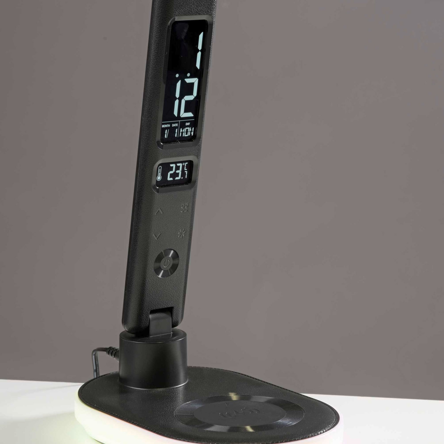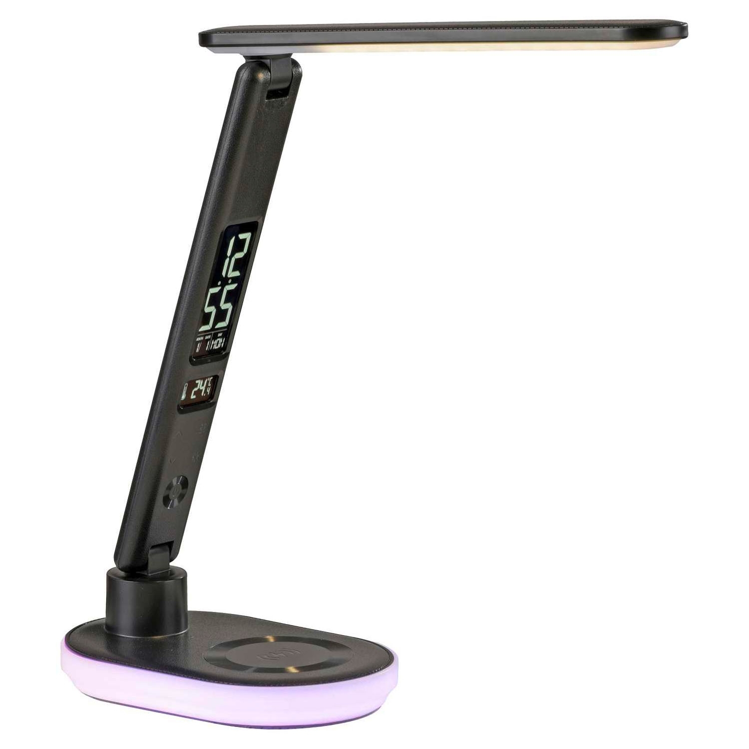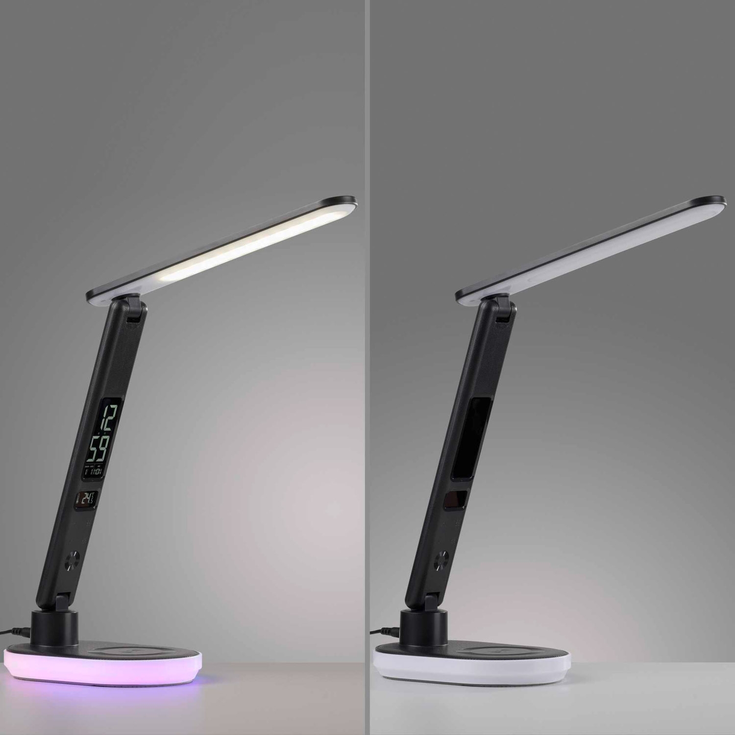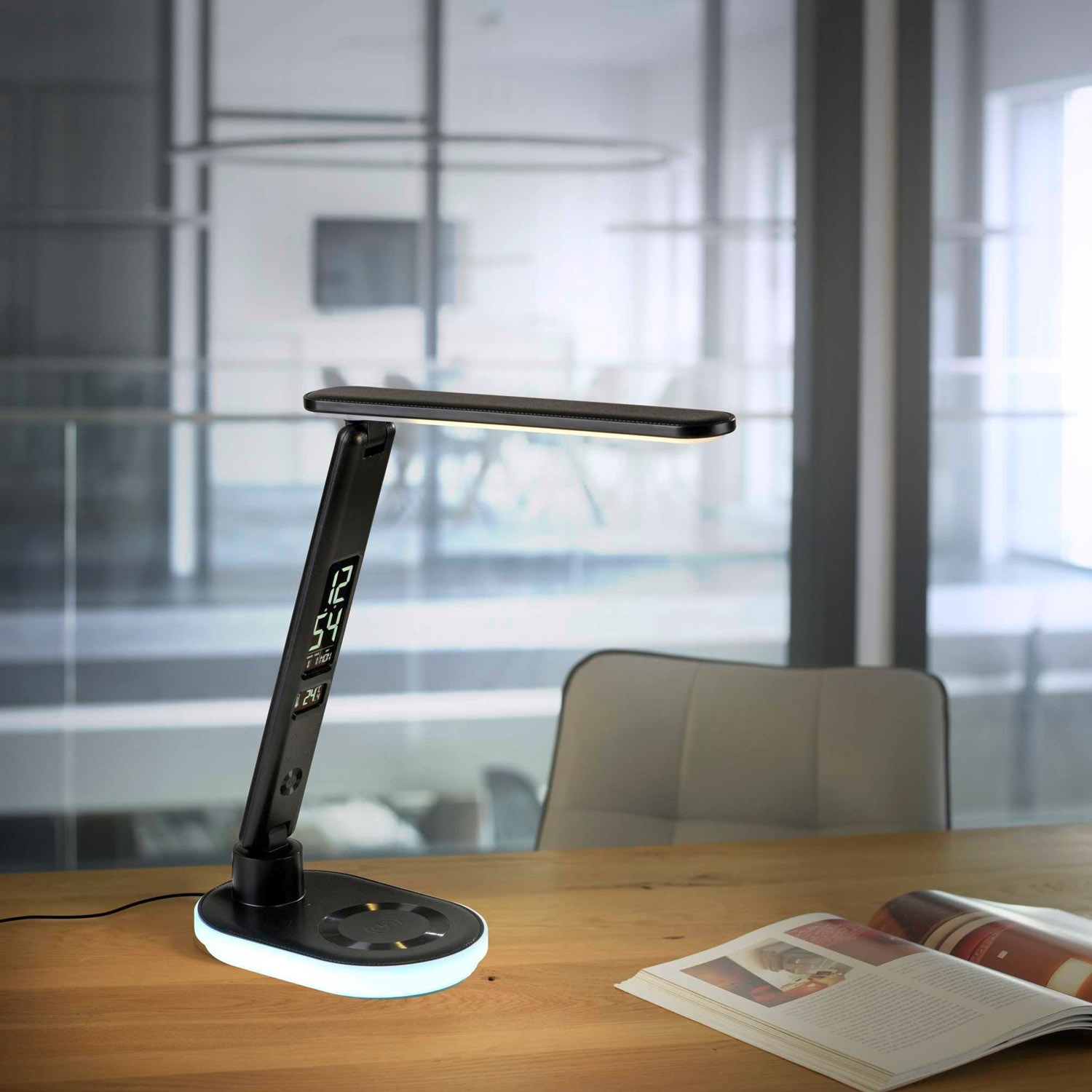 Die LED-Schreibtischleuchte TINA von Just Light ist aus schwarzem Kunststoff gefertigt und bietet zahlreiche praktische Features wie die Anpassung der Farbtemperatur von 3000 bis 5000 K und eine dimmbare Beleuchtung über Touchsensor, ergänzt durch RGB-Farbwechsel. Zusätzlich verfügt die Lampe über eine Zeit-, Datums- und Temperaturanzeige sowie einen USB-Anschluss und eine induktive Ladefläche für Smartphones. Mit einer Breite von 11,4 cm, Höhe von 54 cm und Tiefe von 17,5 cm ist sie kompakt und vielseitig einsetzbar. Die Leuchte enthält zwei fest verbaute LED-Leuchtmittel mit insgesamt 6 Watt und 420 Lumen.