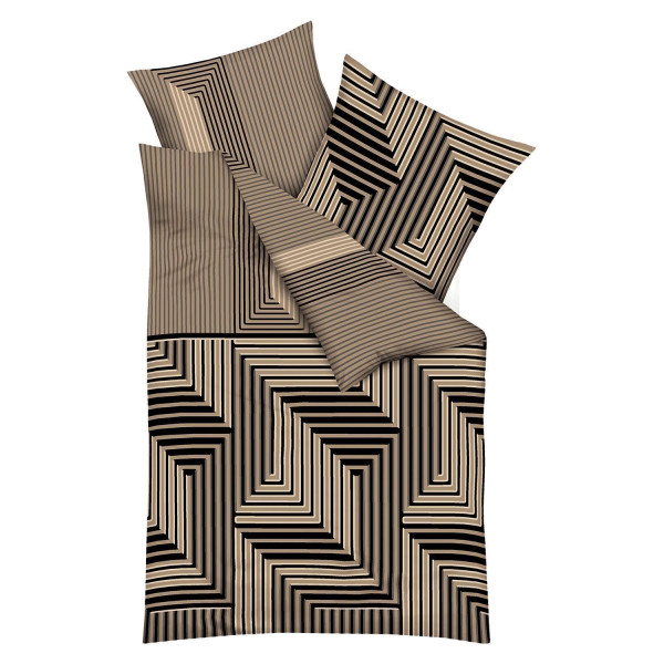 Die Feinbiber-Bettwäsche ESCAPE von kaeppel in Goldgelb und Schwarz bietet weiche Baumwollqualität und eine angenehme Wärme. Der Bettbezug misst 155 x 220 cm und wird durch einen passenden Kissenbezug ergänzt. Der Kopfkissenbezug ist wendbar: Vorder- und Rückseite unterschiedlich gemustert. Ein praktischer Reißverschluss erleichtert das Beziehen. Die Bettwäsche ist bis 60 °C waschbar und trocknergeeignet.