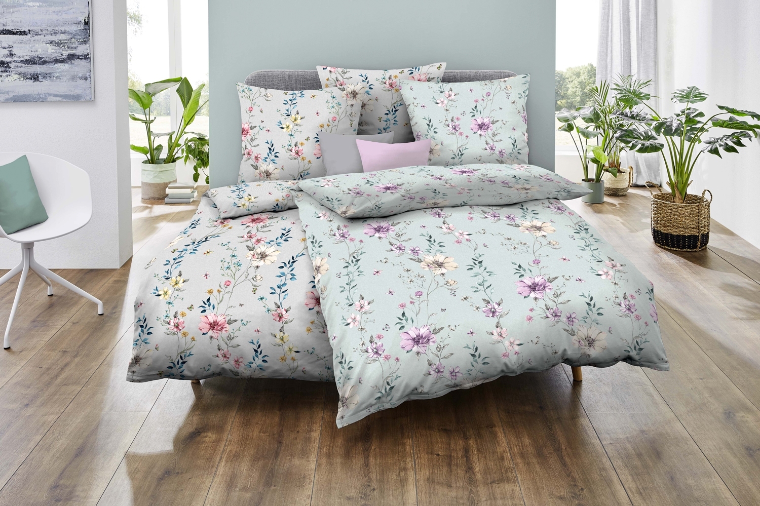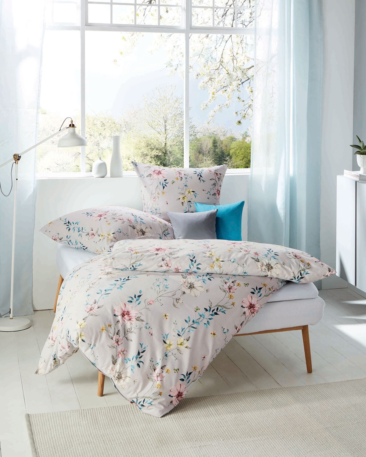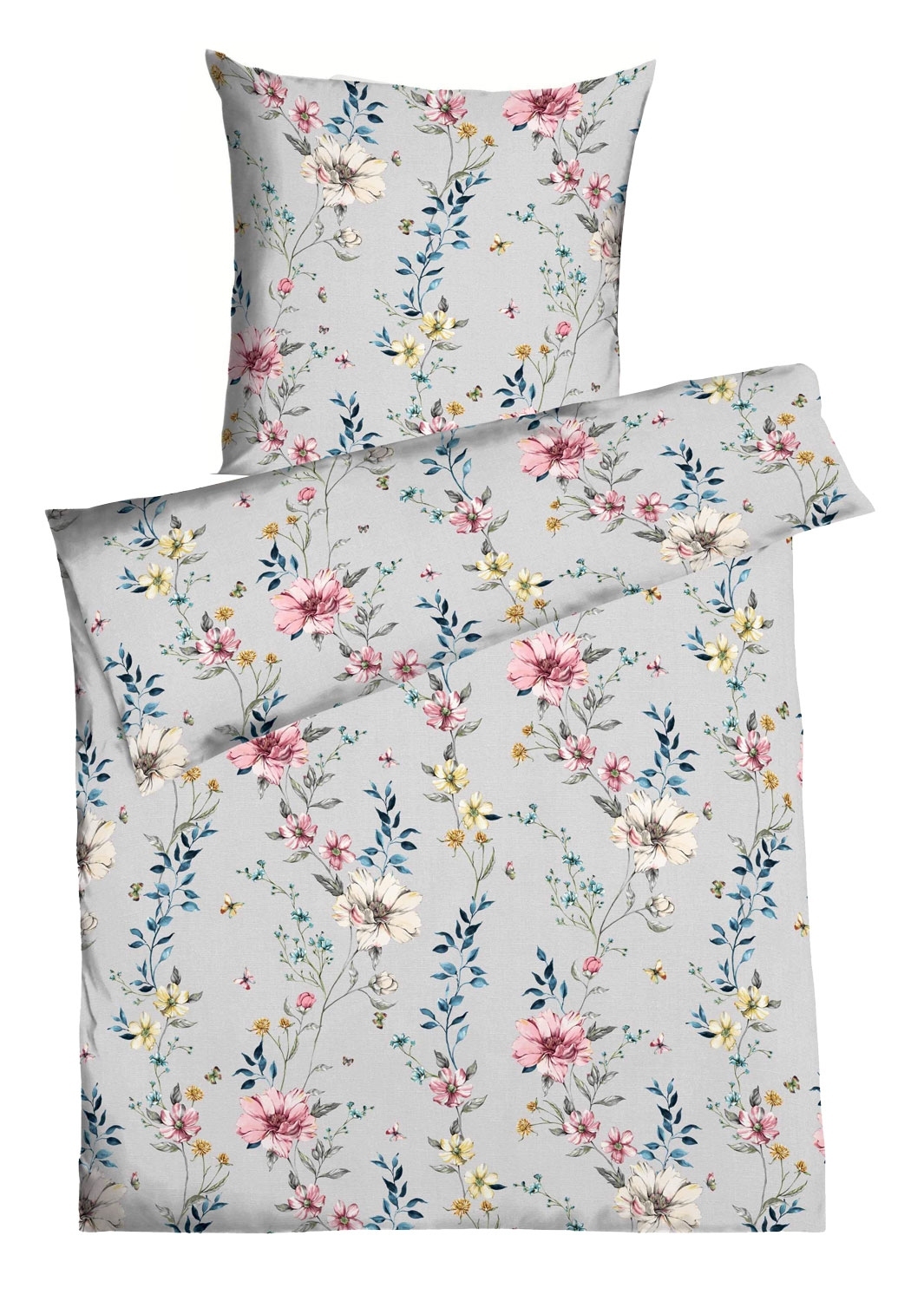 Die Satin-Bettwäsche FLAVIA von kaeppel in Silbergrau, Blau und Rosa bietet mit 135 x 200 cm ultimativen Komfort. Hergestellt aus 100 % Baumwolle, ist sie mit einem Reißverschluss ausgestattet. Pflegeleicht bei 60 °C waschbar und trocknergeeignet. Die Bettwäsche mit floralem Muster ist eine praktische und stilvolle Ergänzung für jedes Schlafzimmer.