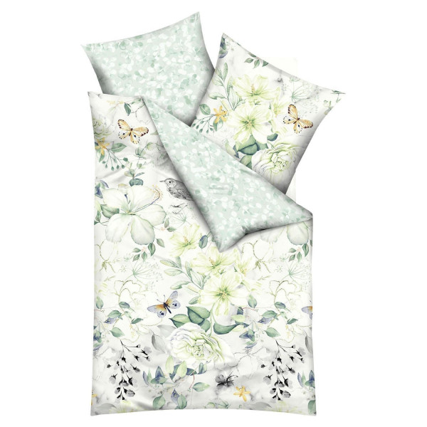 Die Satin-Bettwäsche GREEN GARDEN von kaeppel in Weiß mit Rosen- und Schmetterlingsmuster in Jadegrün und Geld bietet mit 135 x 200 cm ultimativen Komfort. Hergestellt aus 100 % Baumwolle, ist sie mit einem Reißverschluss ausgestattet. Pflegeleicht bei 60 °C waschbar und trocknergeeignet. Eine stilvolle und praktische Ergänzung für jedes Schlafzimmer.
