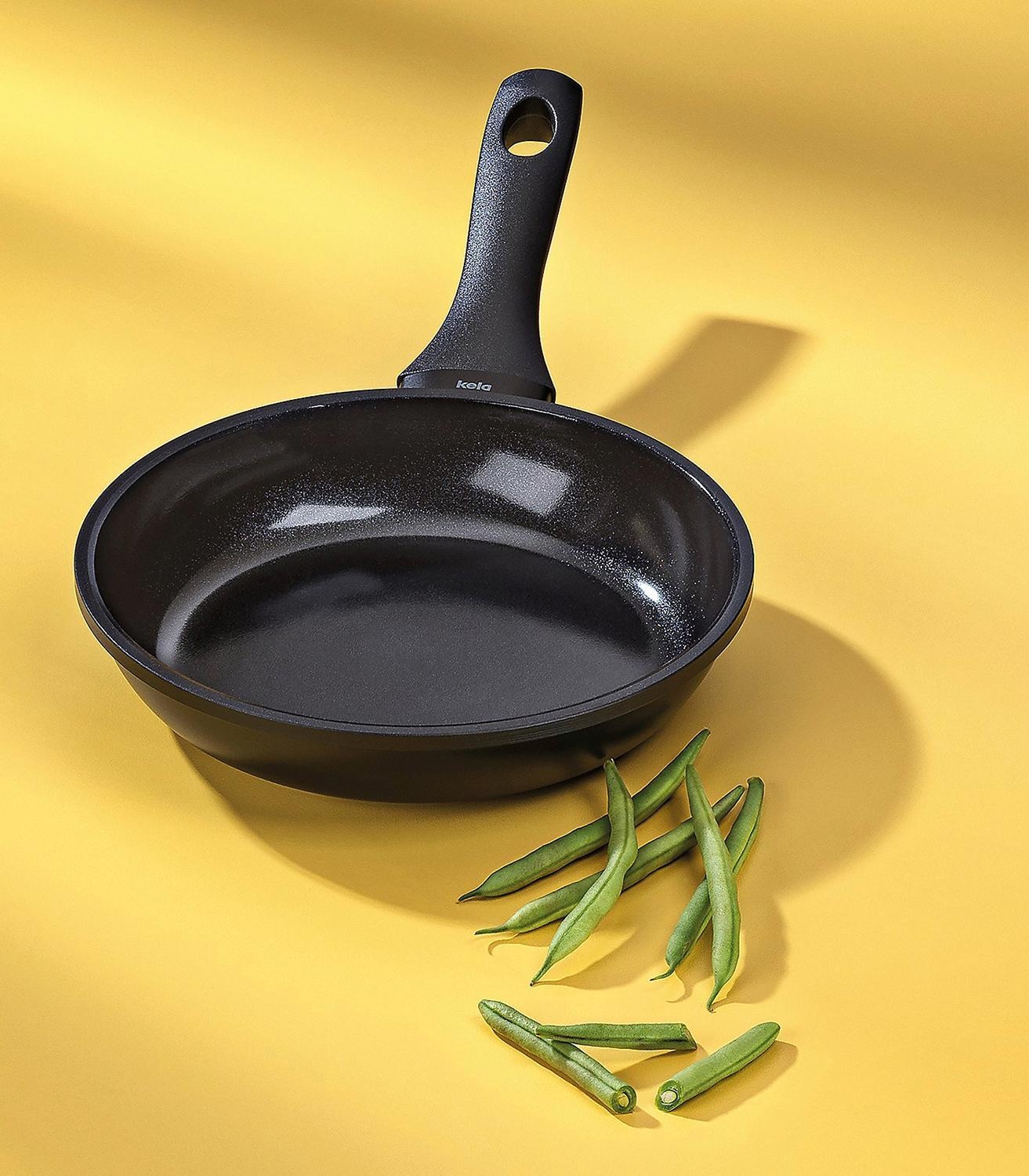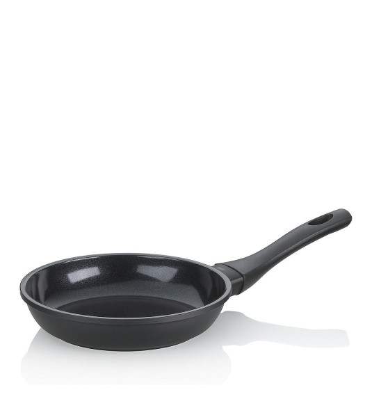 Die Bratpfanne ATURA der Marke Kela ist in der Farbe Schwarz gehalten und besteht aus Aluguss. Sie hat einen Durchmesser von 20 cm und eine Höhe von 4 cm. Die Pfanne ist mit einem ergonomischen Softtouch- Kunststoffstielgriff ausgestattet, der eine komfortable Handhabung ermöglicht. Dank des Allherdbodens ist die Schmorpfanne für alle Herdarten geeignet. Zudem ist die Oberfläche mit einer Keramikversiegelung versehen, die das Anhaften von Speisen reduziert und die Reinigung erleichtert.
