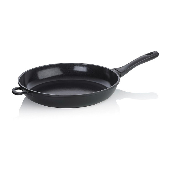 Die Bratpfanne ATURA der Marke Kela ist in der Farbe Schwarz gehalten und besteht aus Aluguss. Sie hat einen Durchmesser von 32 cm und eine Höhe von 6 cm. Die Pfanne ist mit einem ergonomischen Softtouch- Kunststoffstielgriff ausgestattet, der eine komfortable Handhabung ermöglicht. Dank des Allherdbodens ist die Schmorpfanne für alle Herdarten geeignet. Zudem ist die Oberfläche mit einer Keramikversiegelung versehen, die das Anhaften von Speisen reduziert und die Reinigung erleichtert.