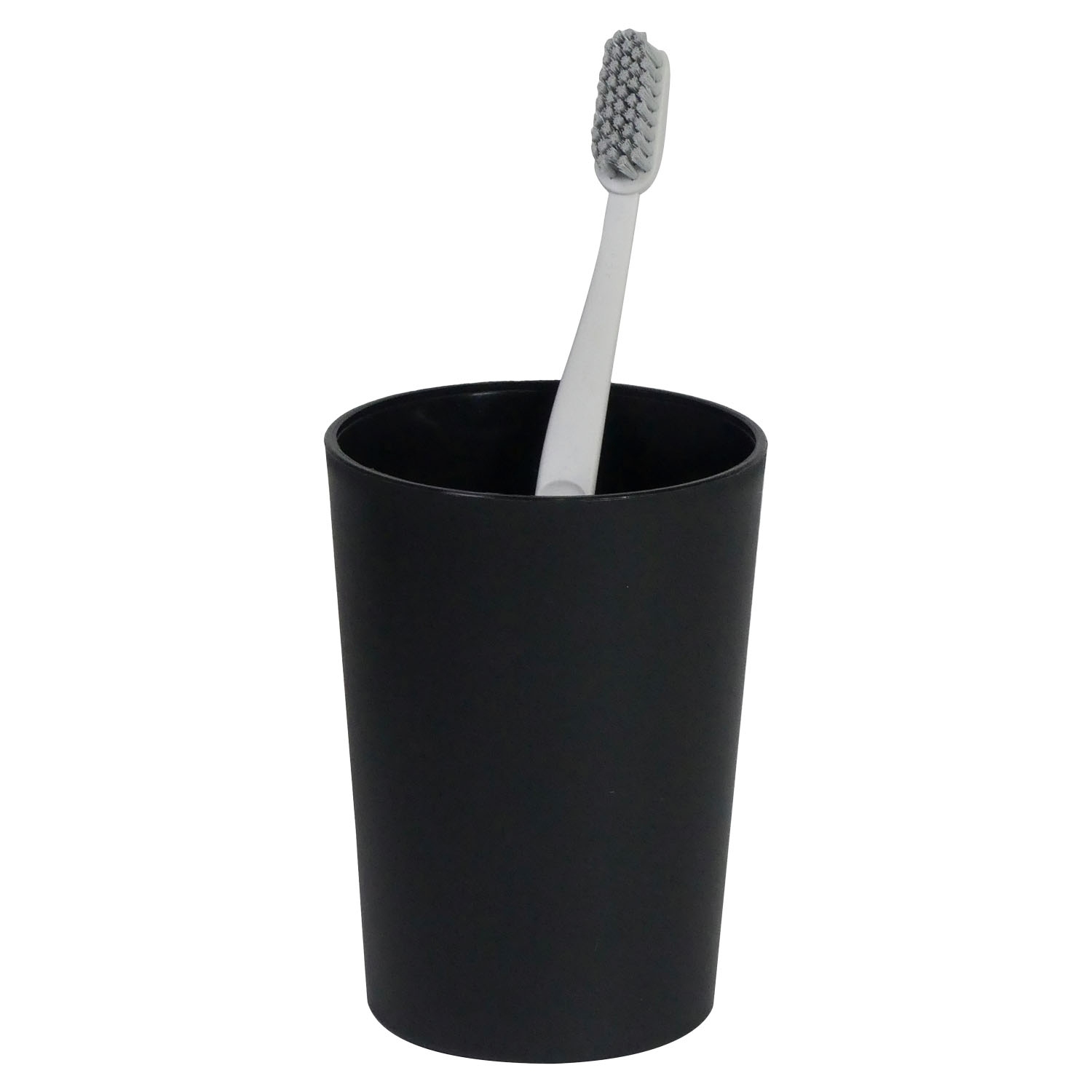 Der Zahnputzbecher MARTA von Kela in stilvollem Schwarz besteht aus pflegeleichtem Kunststoff. Er bietet Platz für Zahnbürsten und kann auch zur Aufbewahrung von Rasier- oder Schminkutensilien genutzt werden. Mit einem Durchmesser von 8 cm und einer Höhe von 11 cm ist er eine praktische Ergänzung für jedes Badezimmer.