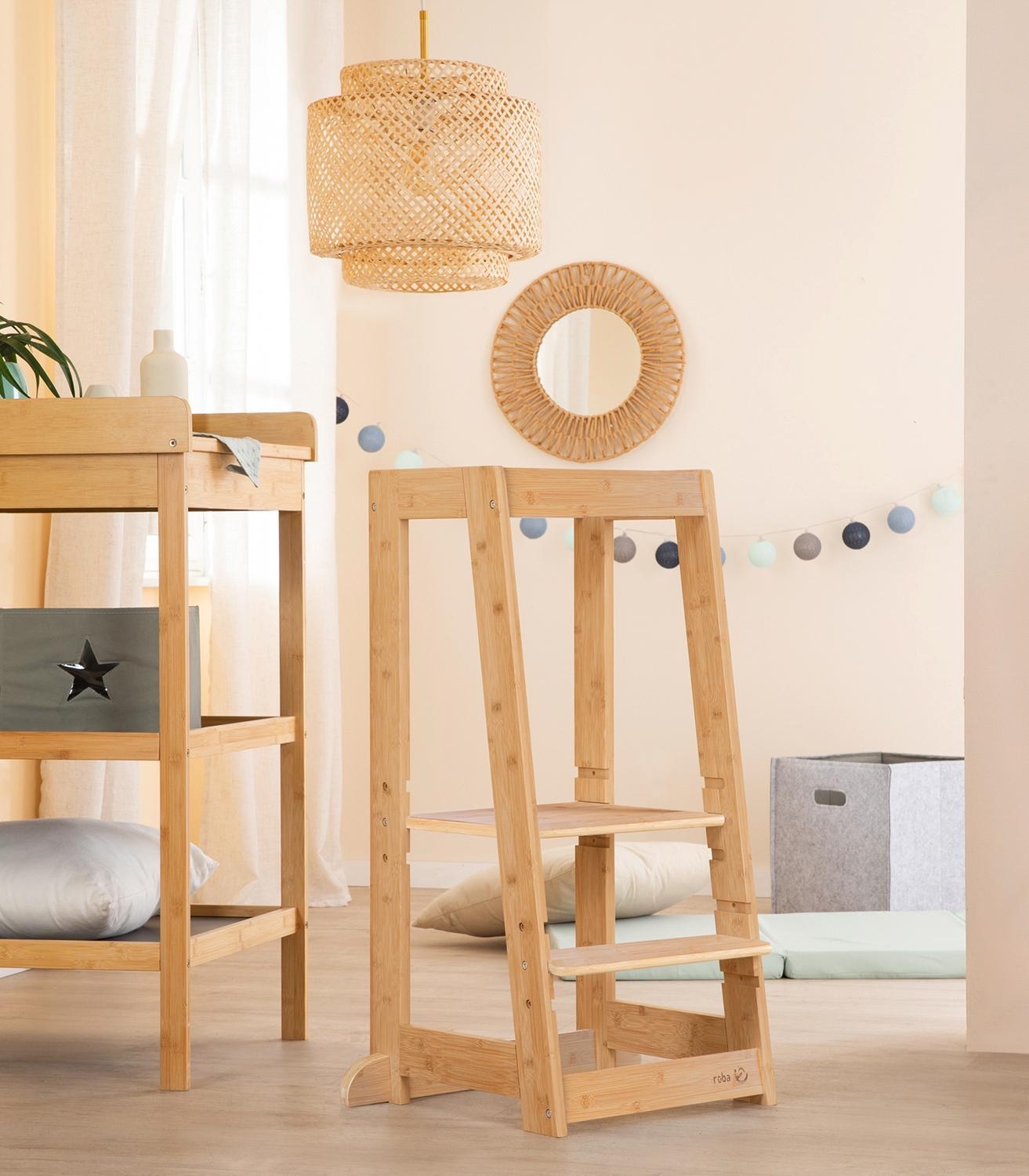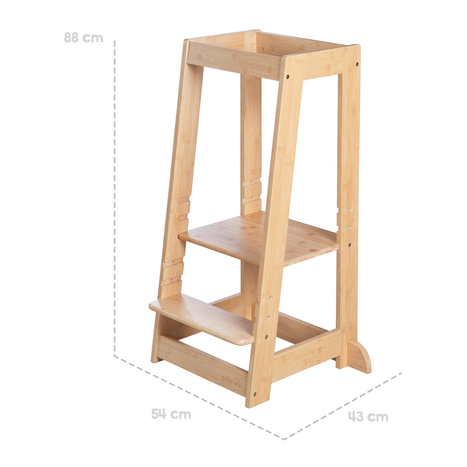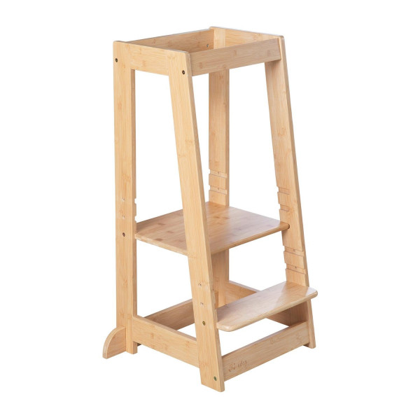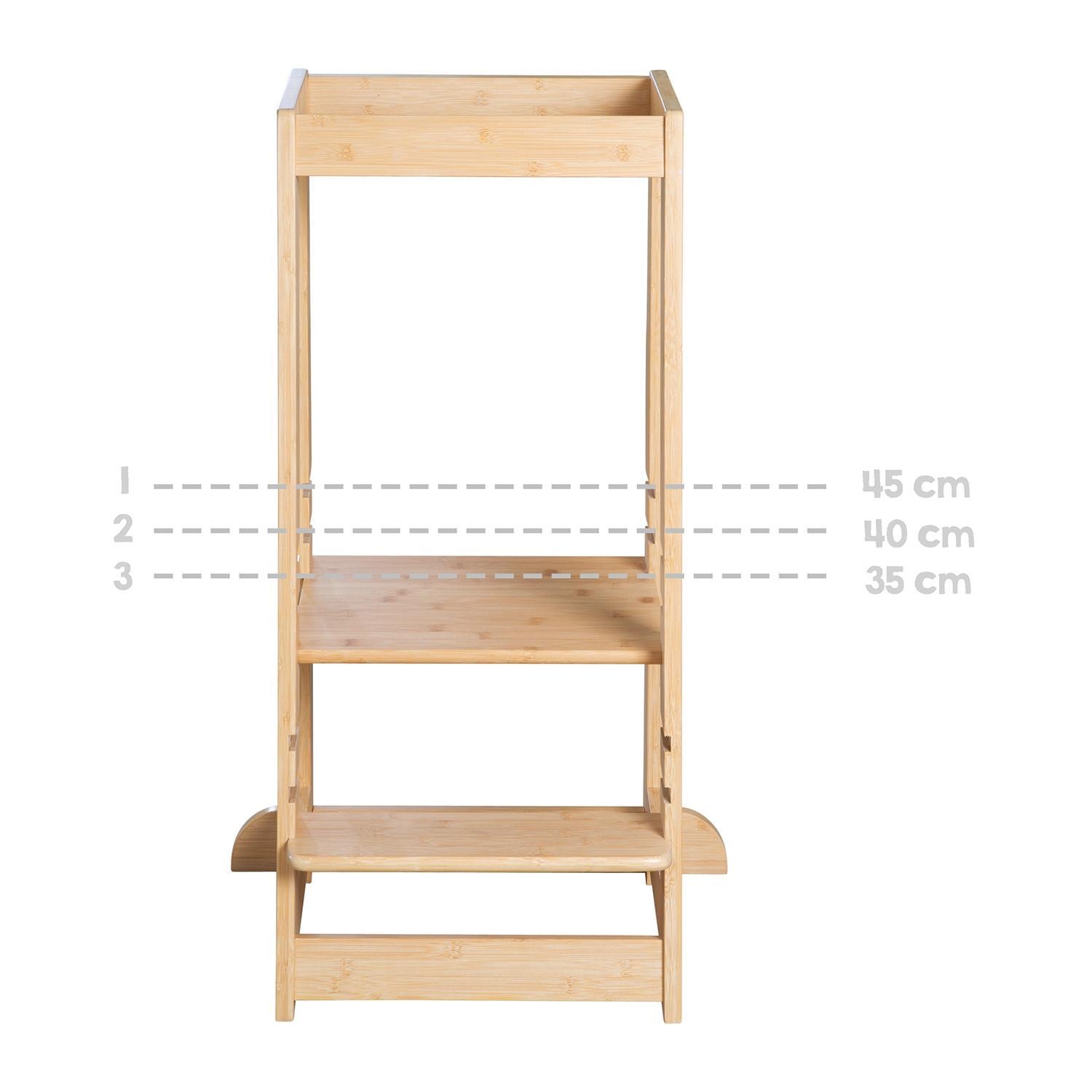 Der Kindertritthocker SIGMAR ist aus lackiertem Bambusholz in Braun gefertigt. Ein wesentliches Merkmal des Hockers ist die 3-fache Höhenverstellbarkeit des Trittbretts und der Standfläche. Die Konstruktion wurde mit abgerundeten Kanten und Ecken ausgeführt, um die Sicherheit zu gewährleisten. Das Modell weist eine Belastbarkeit von bis zu maximal 80 kg auf. Die Abmessungen des Tritthockers betragen 54 cm in der Breite, 88 cm in der Höhe und 44 cm in der Tiefe. Geeignet für Kinder ab einem Alter von 12 Monaten.