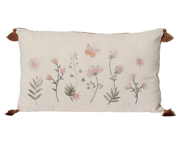 Das Kissen NILENA in Creme kombiniert stilvolle Stickerei mit verspielten Details. Auf einer Größe von 50 x 30 cm ziert eine grüne Blumenwiese den Polyesterbezug, während braune Quasten den Look abrunden. Das Kissen ist gemütlich und dekorativ zugleich – ein Hingucker für jedes Wohnambiente. Mit Reißverschluss versehen und aus 100 % Polyester gefertigt, bietet es eine praktische Pflege und hohen Komfort.