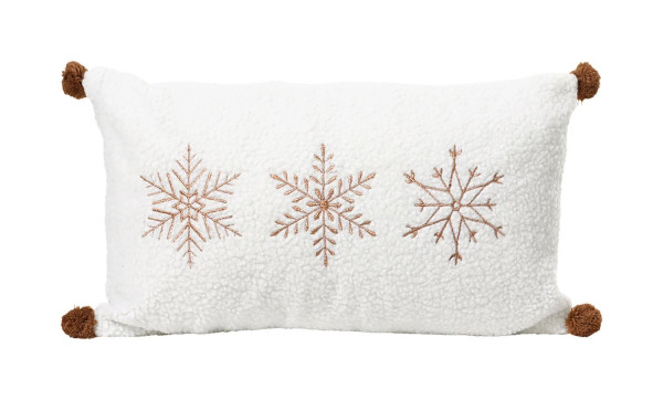 Das flauschige Kissen SNOWFLAKE in Weiß bringt winterliche Gemütlichkeit in Ihr Zuhause. Mit einer Größe von 50 x 30 cm und gefertigt aus weichem Polyester lädt es zum Entspannen ein. Das Schneeflockenmuster in Braun verleiht dem Kissen einen warmen, saisonalen Charme, während die vier Bommel an den Ecken in passendem Braunton für einen verspielten Akzent sorgen. Ideal als Dekoration auf Sofa, Sessel oder Bett für eine stimmungsvolle Winteratmosphäre.