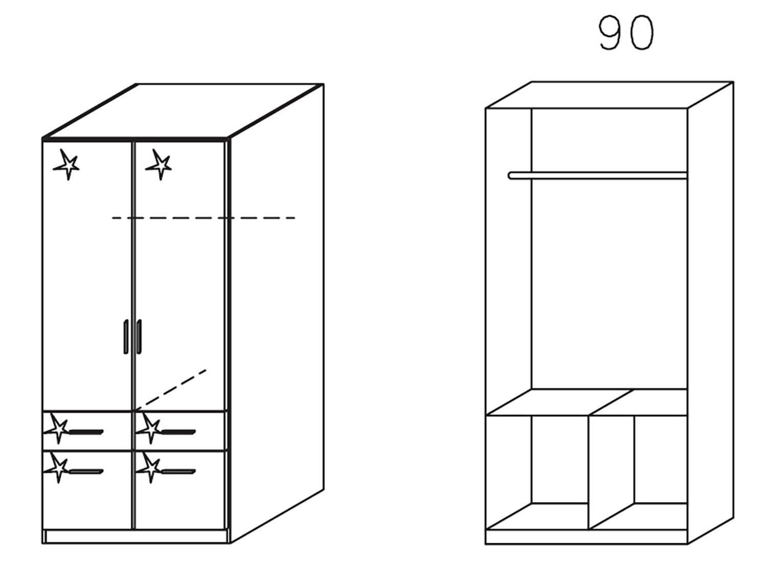 | Lieferumfang: | 1 Kleiderschrank mit 2 Türen, 4 Schubladen und 1 Kleiderstange |