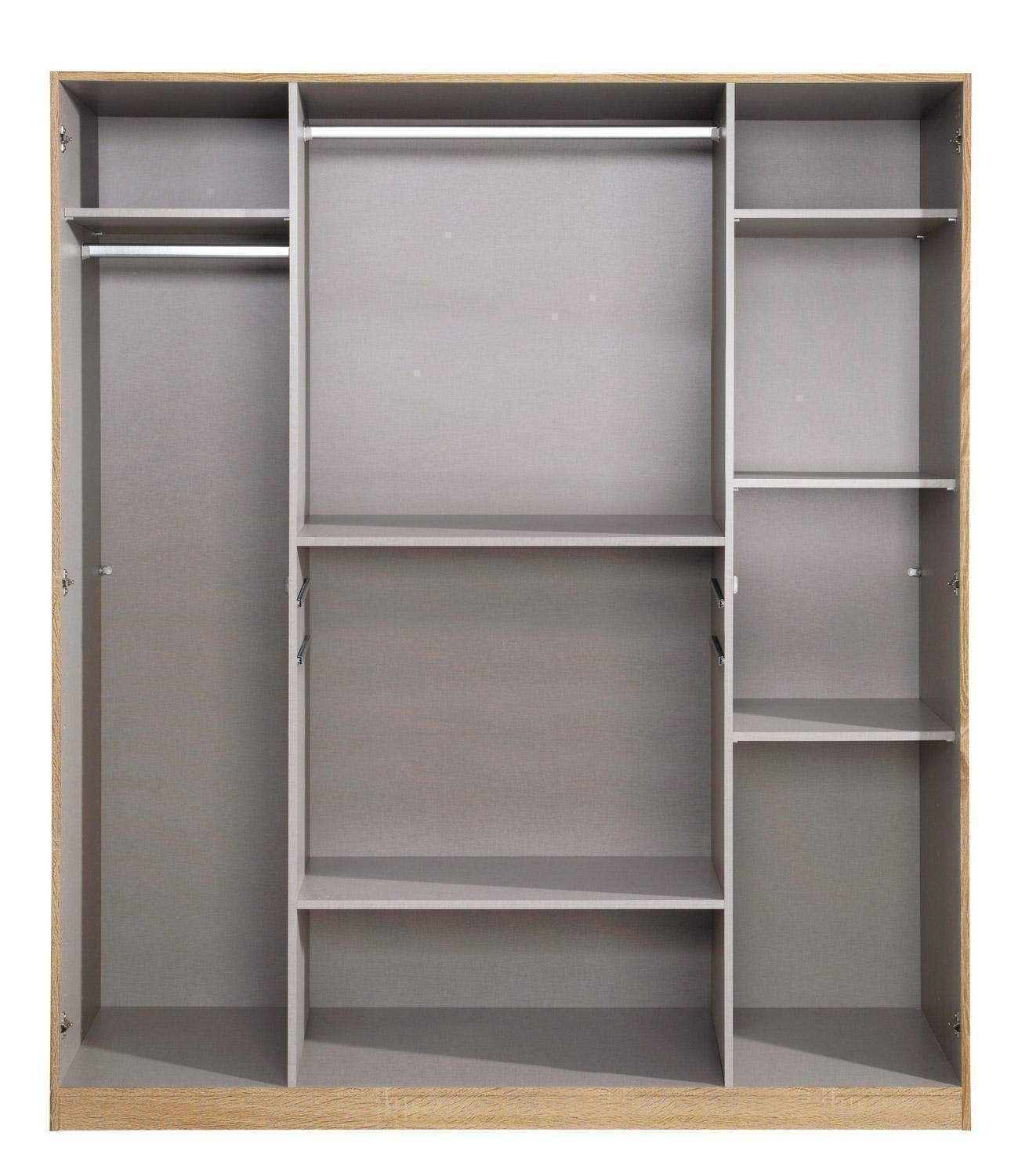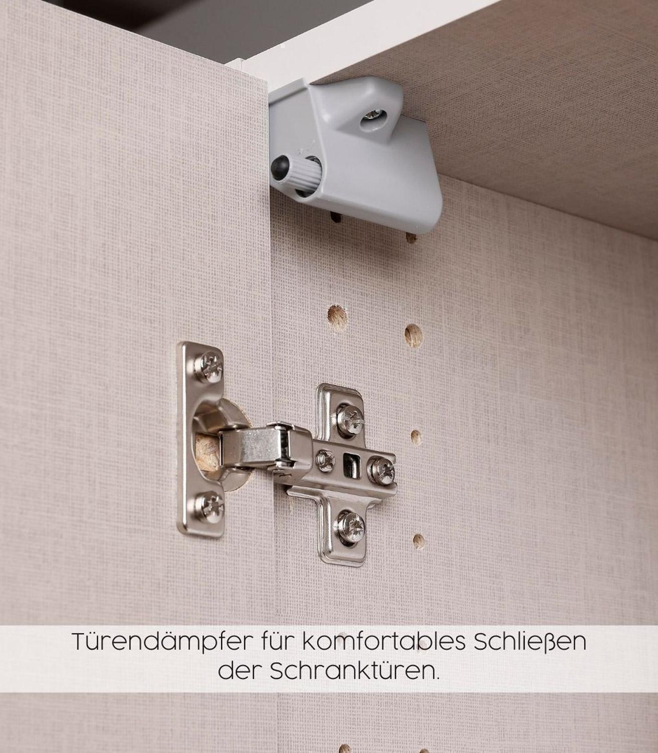 Dieser Kleiderschrank hat im Inneren ein Dekor in Leinenoptik. Zu einigen Kleiderschränken bieten wir Zubehör wie Schubkästeneinsätze, Wäscheeinteilungen, zusätzliche Fachböden und Türdämpfer an.