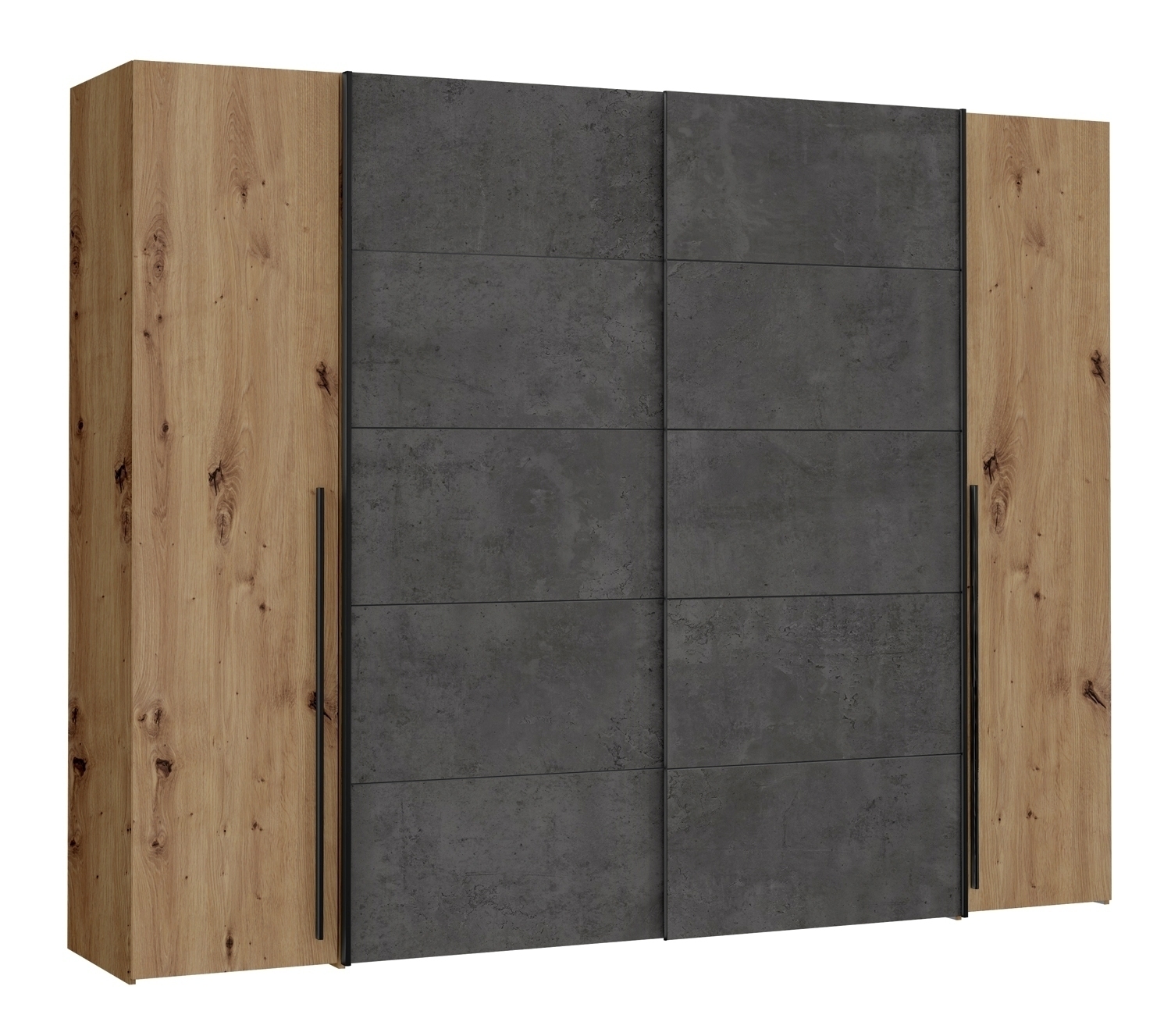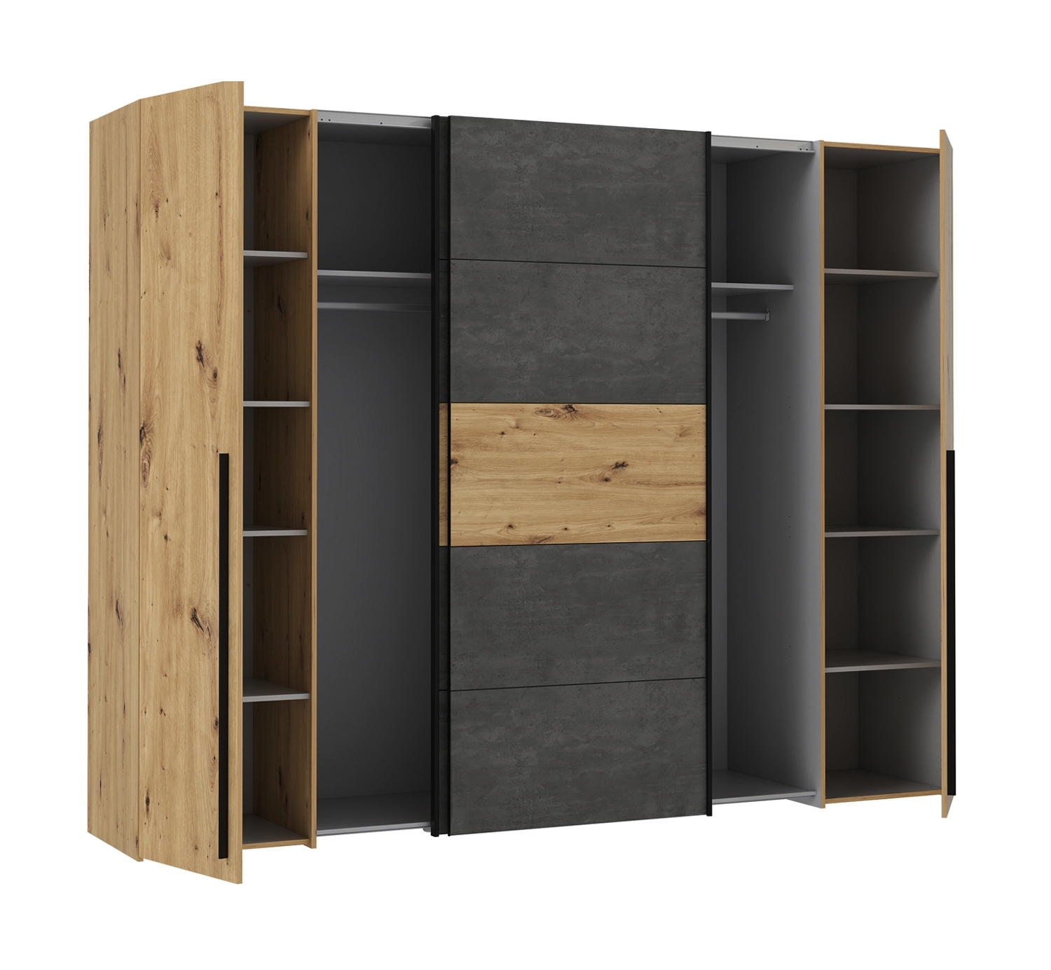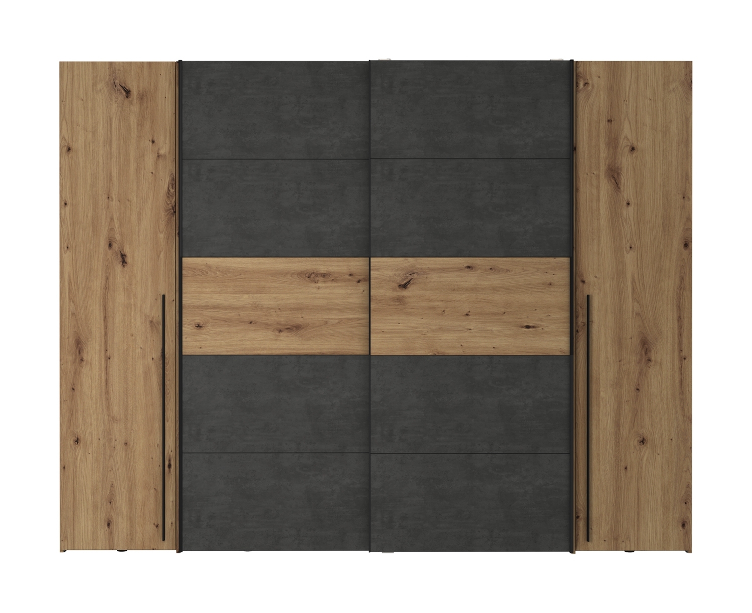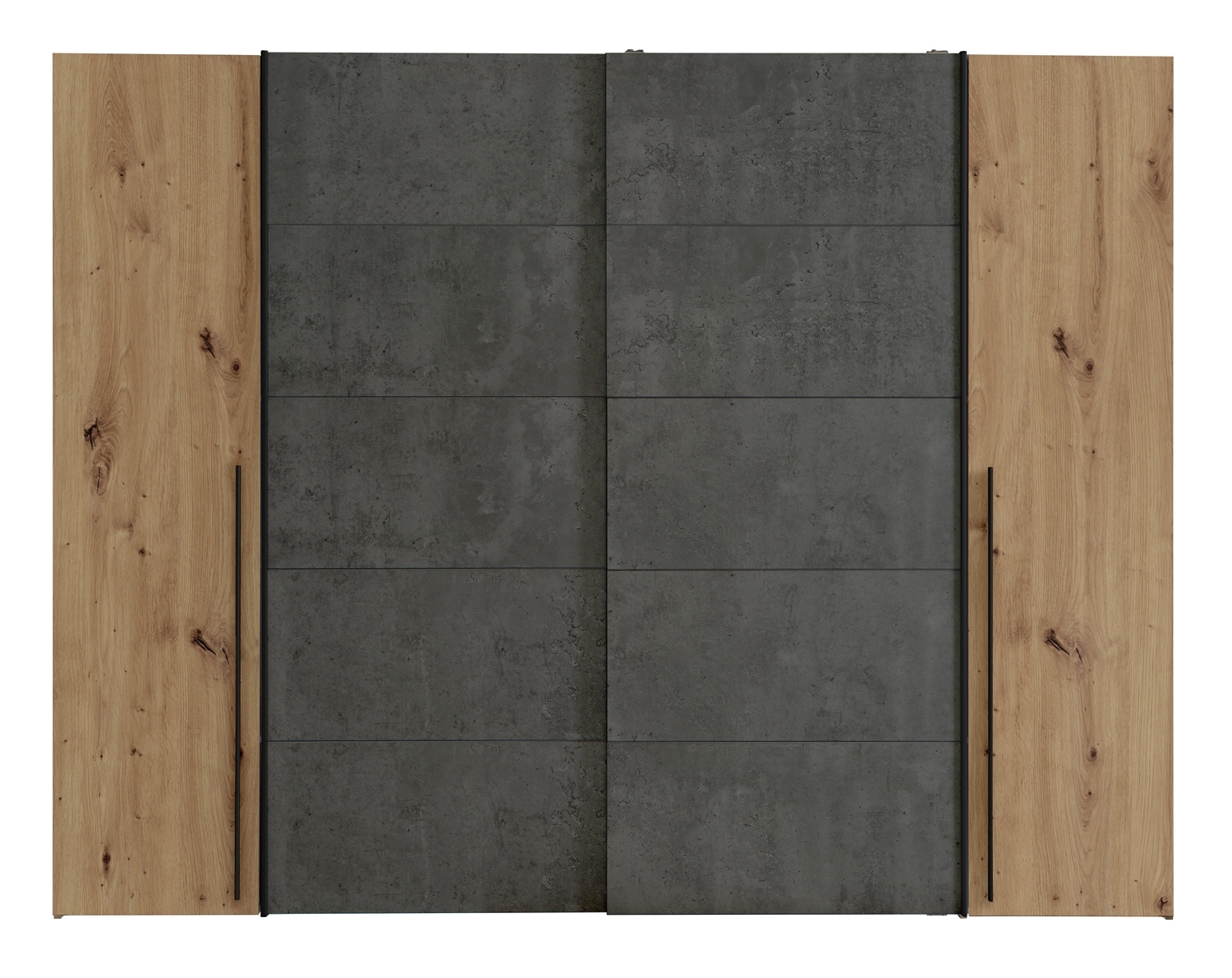 Wechselbauchbinde: Beim Aufbau der beiden Schwebetüren können Sie selber entscheiden, ob Sie 2 der Türen-Absetzungen mit ihrer Rückseite verwenden die ein Artisan Eiche Dekor hat. Oder Sie entscheiden sich dazu, dass die Schwebetüren komplett in Betondekor sein sollen.