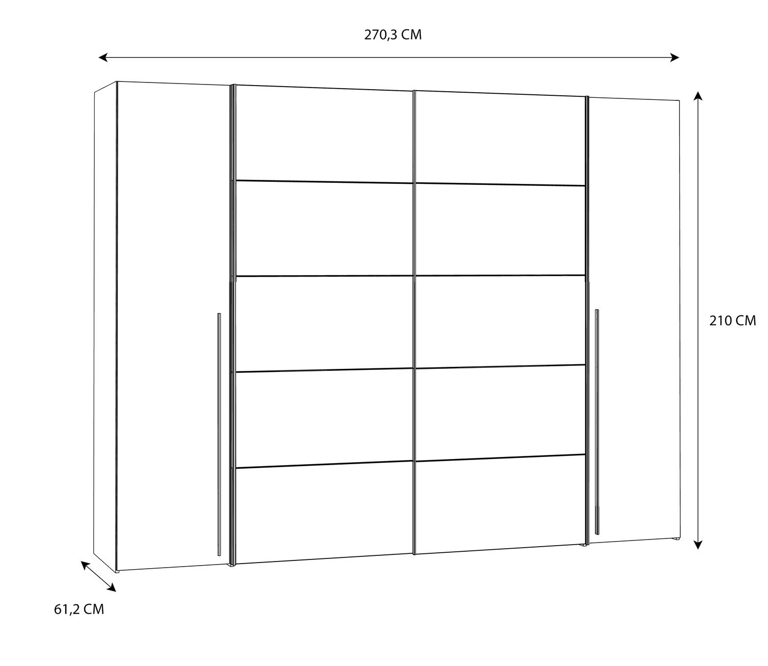 | Lieferumfang: | 1 Kleiderschrank mit 2 Drehtüren, 2 Schwebetüren, 2 Kleiderstangen, 10 Einlegeböden und Wechselbauchbinde |