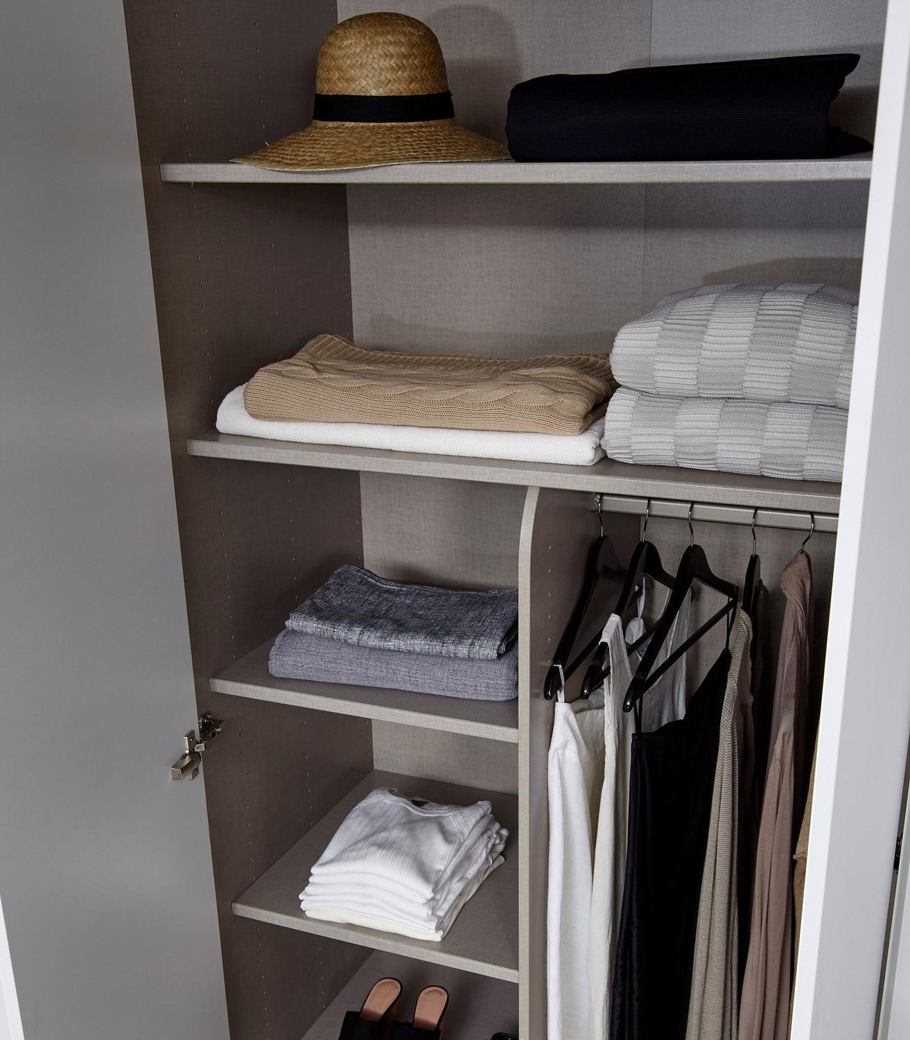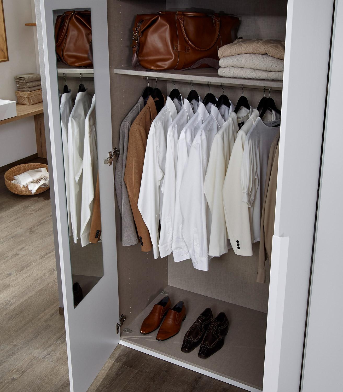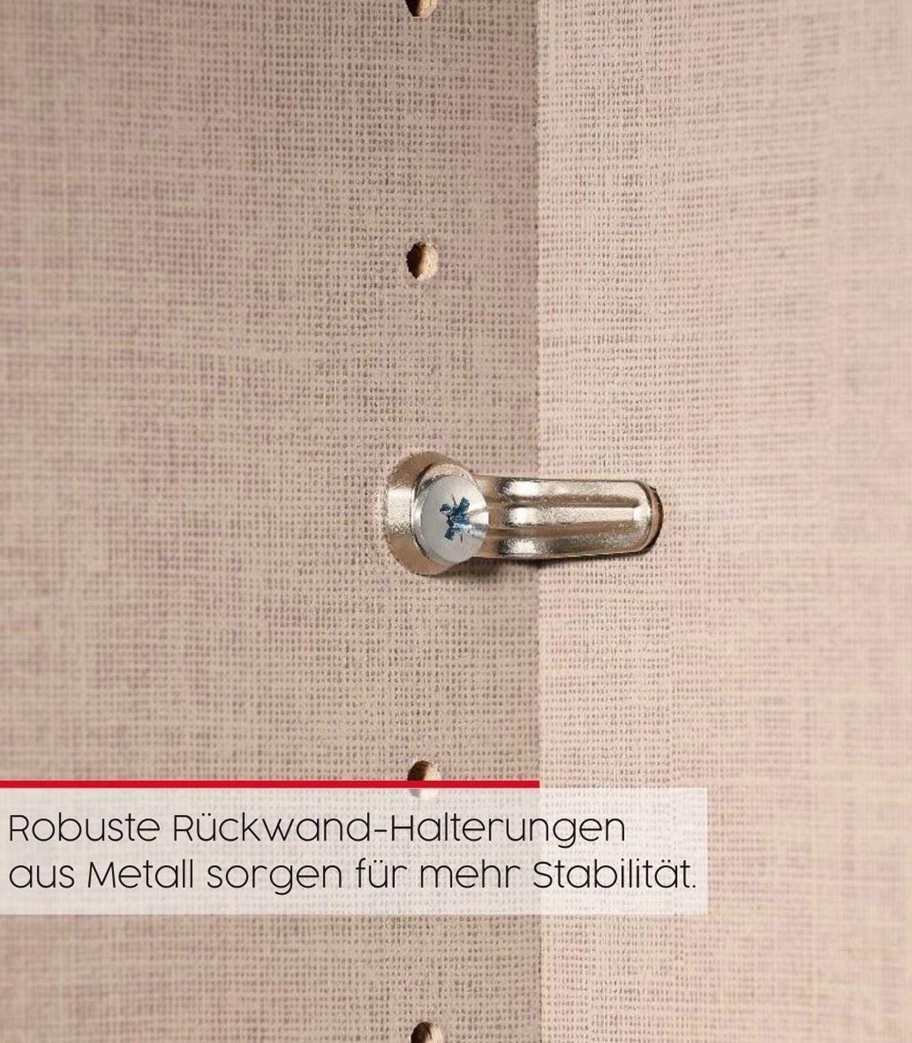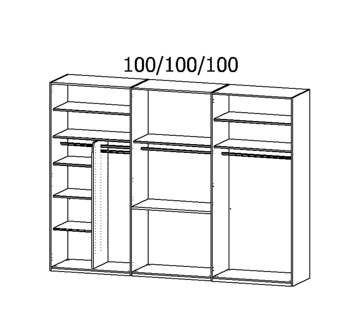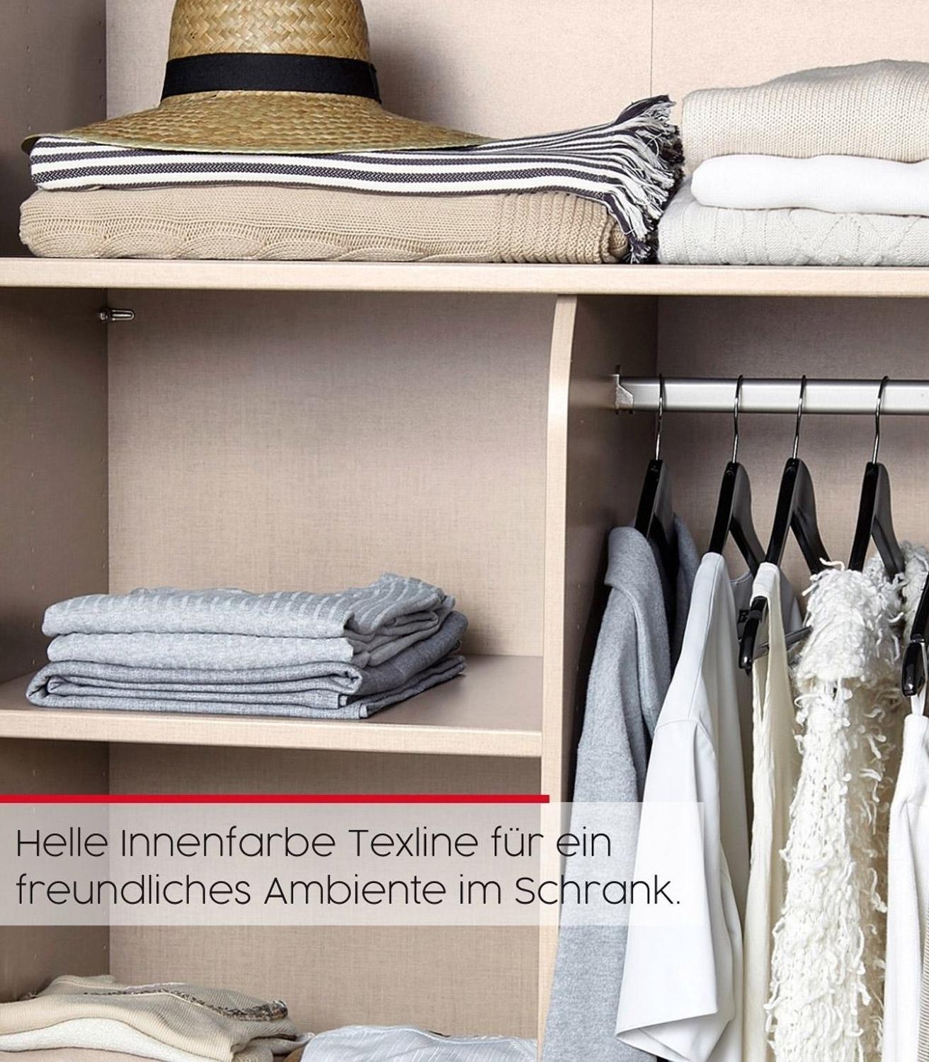 Dieser Kleiderschrank hat im Inneren ein Texline Dekor in der Farbe Grau. Zu einigen Kleiderschränken bieten wir Zubehör wie Schubkästeneinsätze, Wäscheeinteilungen, zusätzliche Fachböden und Türdämpfer an.