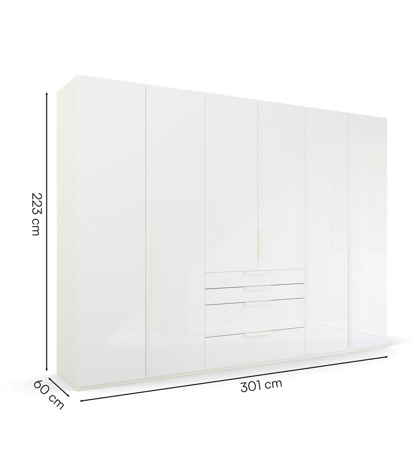 Der Kleiderschrank PERANO ist in Alpinweiß gehalten und verfügt über Fronten aus Glas in Kristallweiß. Er ist mit sechs Türen und vier Schubladen mit Soft-Close-Funktion ausgestattet. Zusätzlich enthält der Schrank einen Krawattenhalter und einen Innenspiegel. Im Inneren befinden sich drei Kleiderstangen und neun Einlegeböden. Die Maße betragen 301 cm in der Breite, 223 cm in der Höhe und 61 cm in der Tiefe.