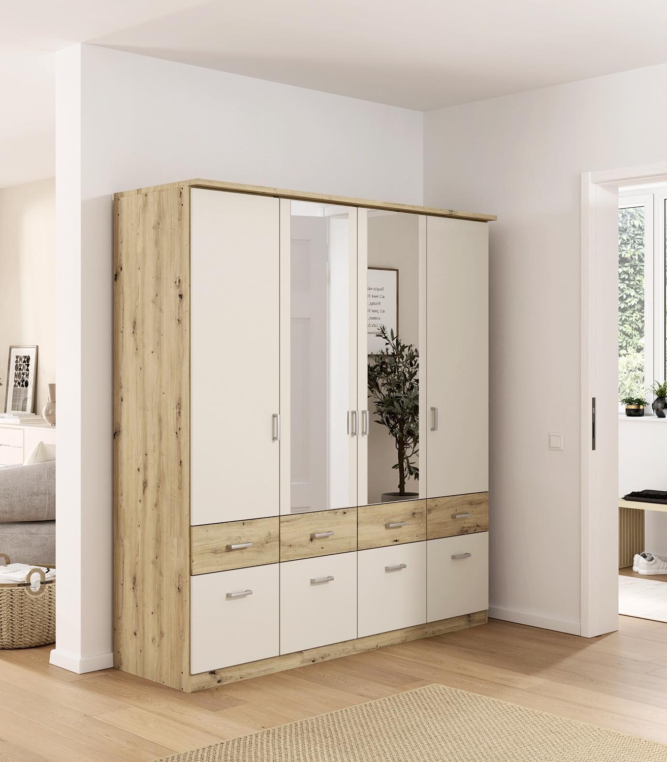Der Kleiderschrank RÜDIGER ist in einem Artisan Eiche Dekor gehalten. Die Front ist champagnerfarben gestaltet und mit Absetzungen in Artisan Eiche Dekor versehen. Der Schrank ist mit zwei Spiegeltüren, zwei weiteren Türen sowie acht Schubladen ausgestattet. Im Innenraum befindet sich eine Kleiderstange und sechs Einlegeböden. Die Maße des Schranks betragen 181 cm in der Breite, 199 cm in der Höhe und 56 cm in der Tiefe.