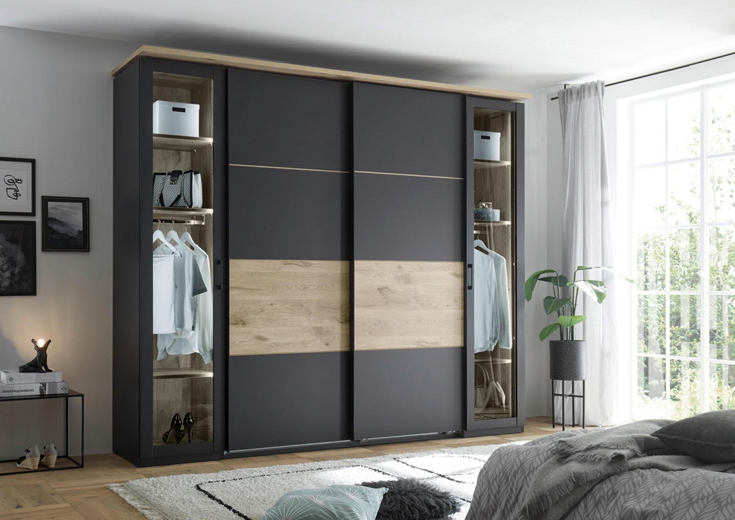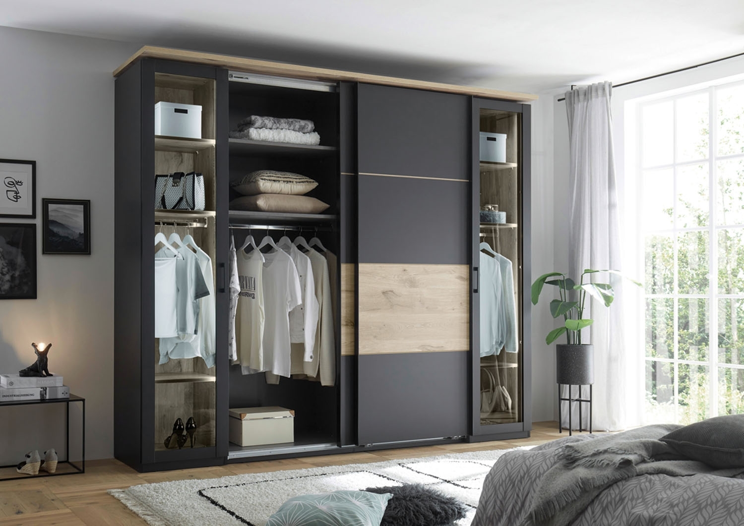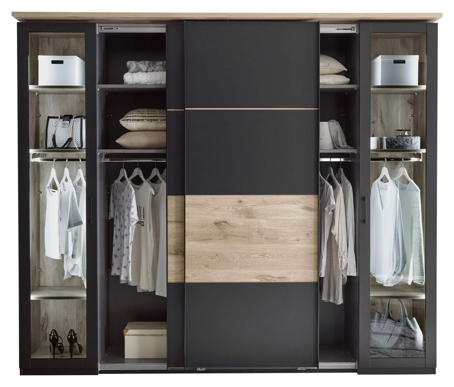 Der Kleiderschrank präsentiert sich mit 2 Drehtüren und 2 Schwebetüren, ausgestattet mit insgesamt 4 Kleiderstangen und 10 Einlegeböden. In Anthrazit und Viking Eiche Dekor gehalten, integriert er sich stilvoll in verschiedenste Raumkonzepte. Die Drehtüren verfügen über geschwärzte Glasfronten, welche den Inhalt des Kleiderschrankes auch nicht durch außen einfallendes Licht preisgeben. Mit einer beeindruckenden Breite von 267 cm, einer Höhe von 225 cm und einer Tiefe von 61 cm bietet er großzügigen Stauraum für Ihre Kleidung. Mit Extras wie Einlegeböden, Kleiderstangen und Türen ist er optimal auf die Bedürfnisse eines organisierten Kleiderschranks abgestimmt. Lieferung ohne Beleuchtung und Kranzleiste.