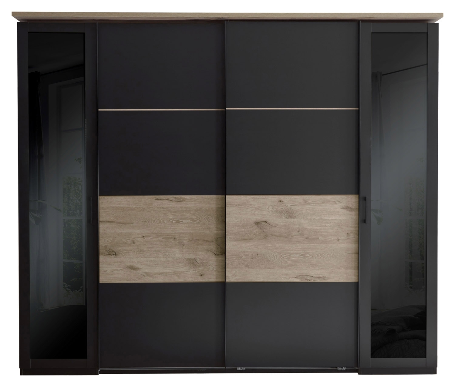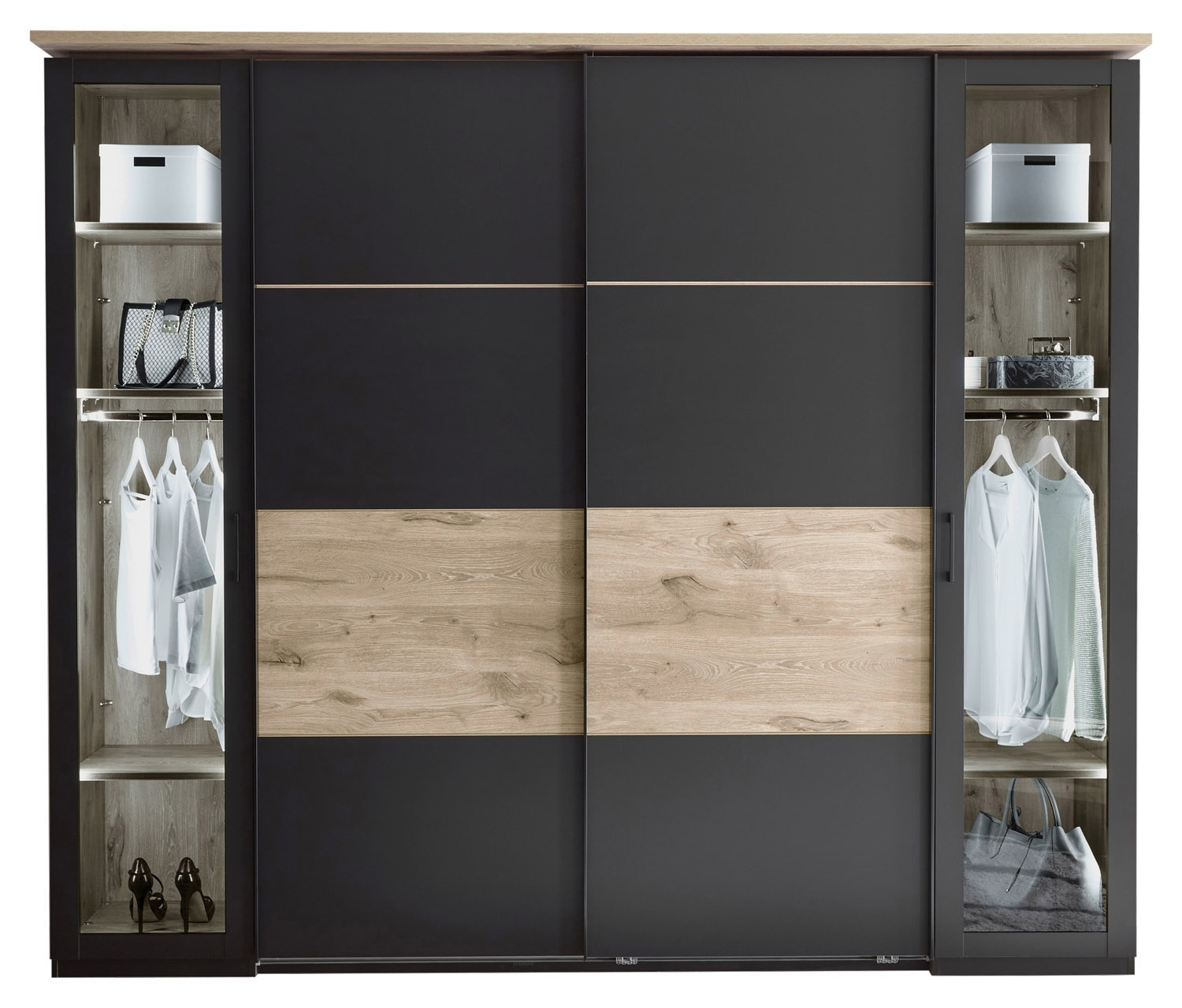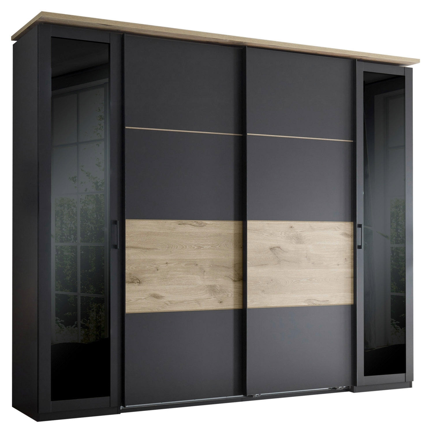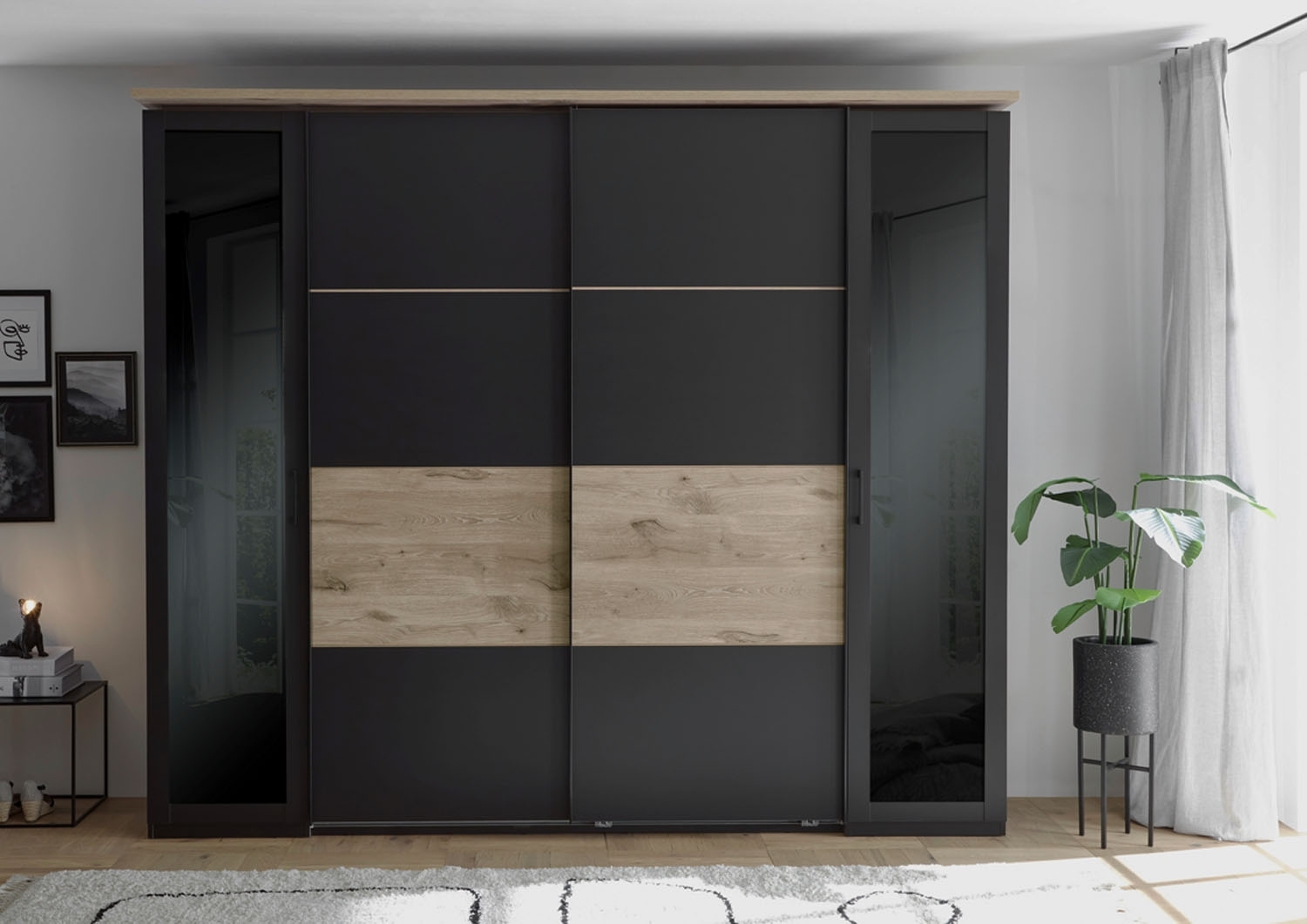 Der Kleiderschrank präsentiert sich mit 2 Drehtüren und 2 Schwebetüren, ausgestattet mit insgesamt 4 Kleiderstangen und 10 Einlegeböden. In Anthrazit und Viking Eiche Dekor gehalten, integriert er sich stilvoll in verschiedenste Raumkonzepte. Die Drehtüren verfügen über geschwärzte Glasfronten, welche den Inhalt des Kleiderschrankes auch nicht durch außen einfallendes Licht preisgeben. Mit einer beeindruckenden Breite von 267 cm, einer Höhe von 225 cm und einer Tiefe von 61 cm bietet er großzügigen Stauraum für Ihre Kleidung. Mit Extras wie Einlegeböden, Kleiderstangen und Türen ist er optimal auf die Bedürfnisse eines organisierten Kleiderschranks abgestimmt. Lieferung ohne Beleuchtung und Kranzleiste.