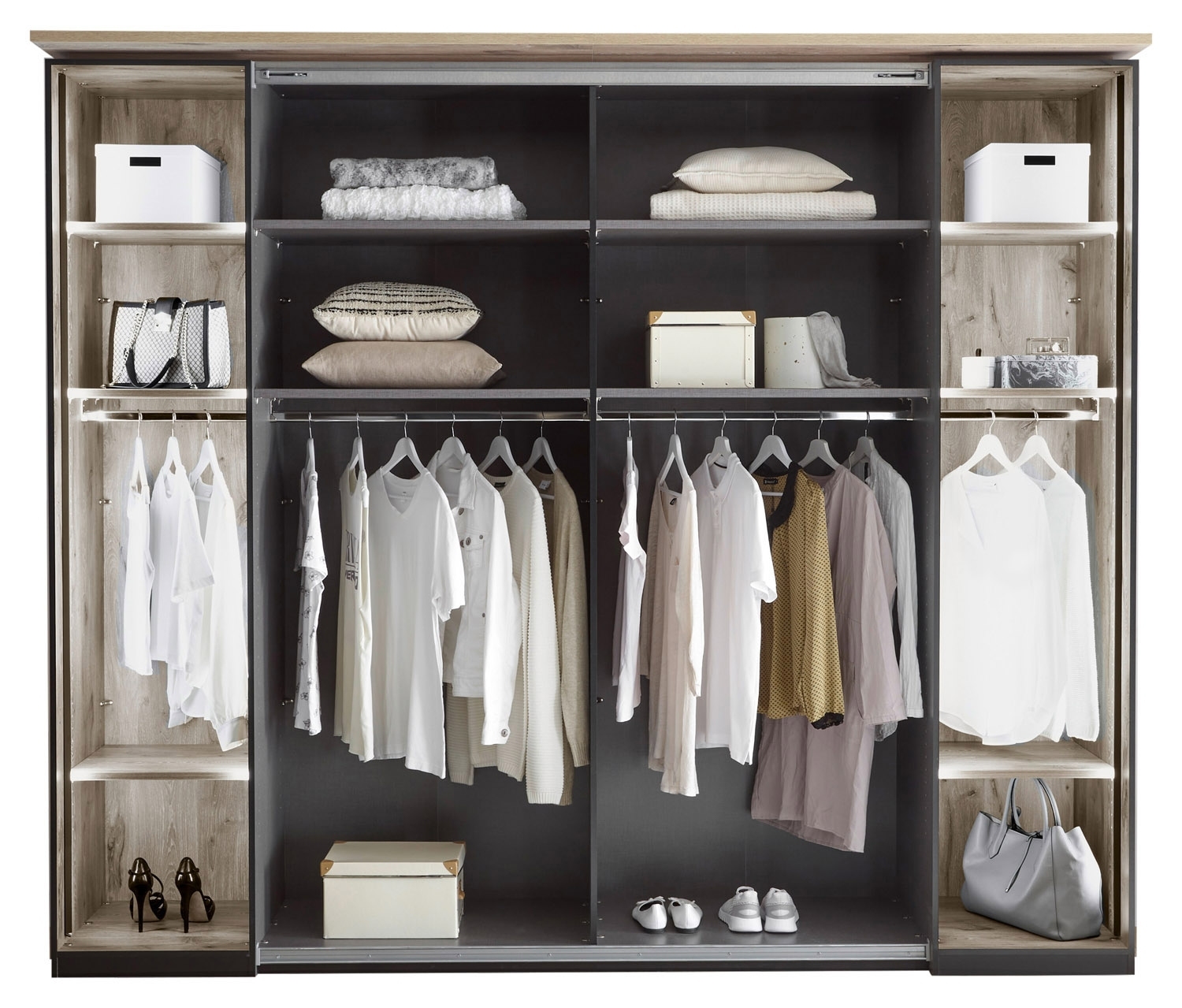 Dieser Kleiderschrank hat im Inneren ein Dekor in brauner Holzoptik und anthrazit. Zu einigen Kleiderschränken bieten wir Zubehör wie Schubkästeneinsätze, Wäscheeinteilungen, zusätzliche Fachböden und Türdämpfer an.