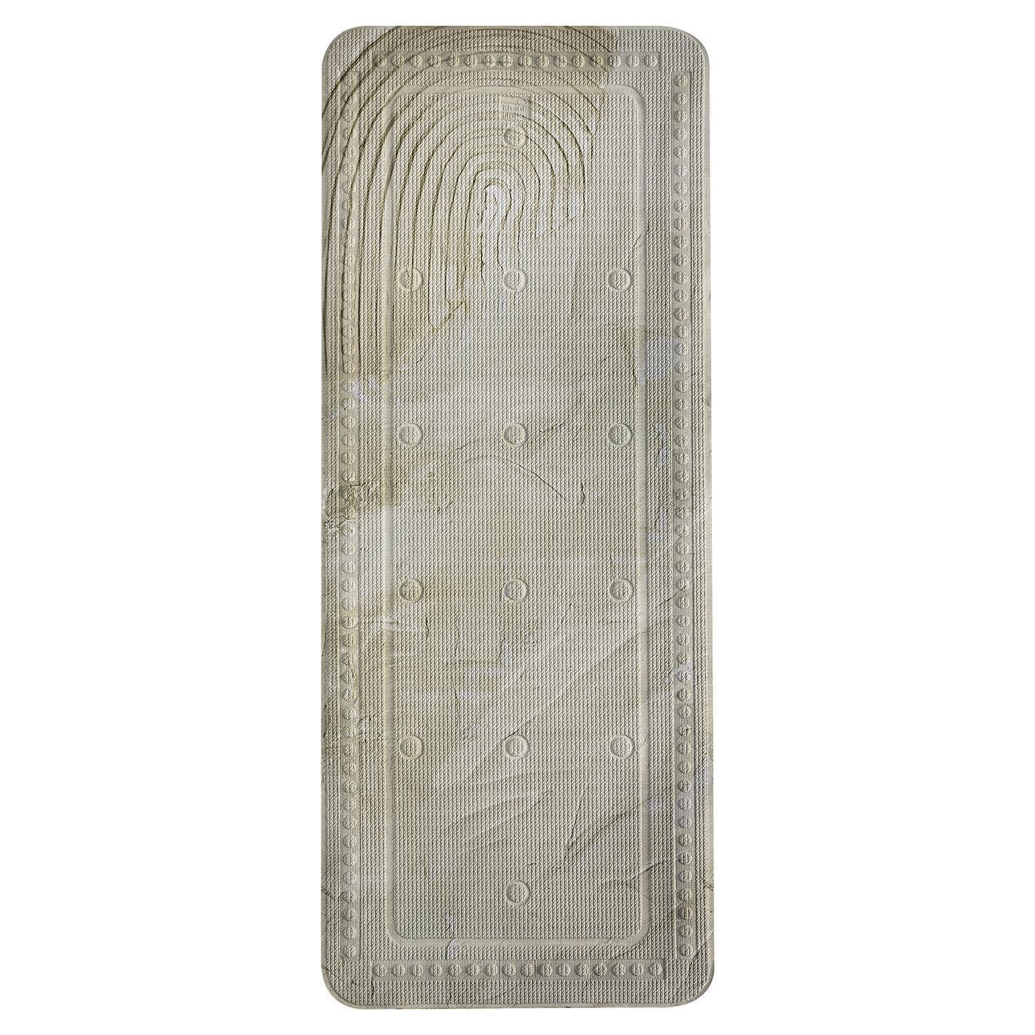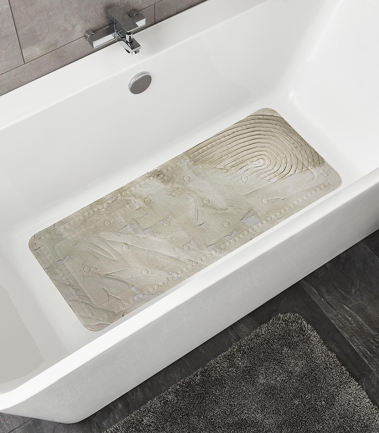 Die Wanneneinlage ART ist in der Farbe Beige gehalten und hat eine Länge von 92 cm sowie eine Breite von 36 cm. Sie besteht aus PVC und ist auf der Oberseite mit kreisförmig angeordneten Noppen ausgestattet, die für einen sicheren Stand in der Badewanne sorgen. Auf der Unterseite befinden sich mehrere Saugnäpfe, die ein Verrutschen auf glatten Oberflächen verhindern. Zusätzlich ist die Wanneneinlage mit einer integrierten Öse auf der Rückseite versehen, wodurch sie nach der Nutzung einfach aufgehängt und getrocknet werden kann. Die Reinigung ist im 40-Grad-Schonwaschgang möglich.