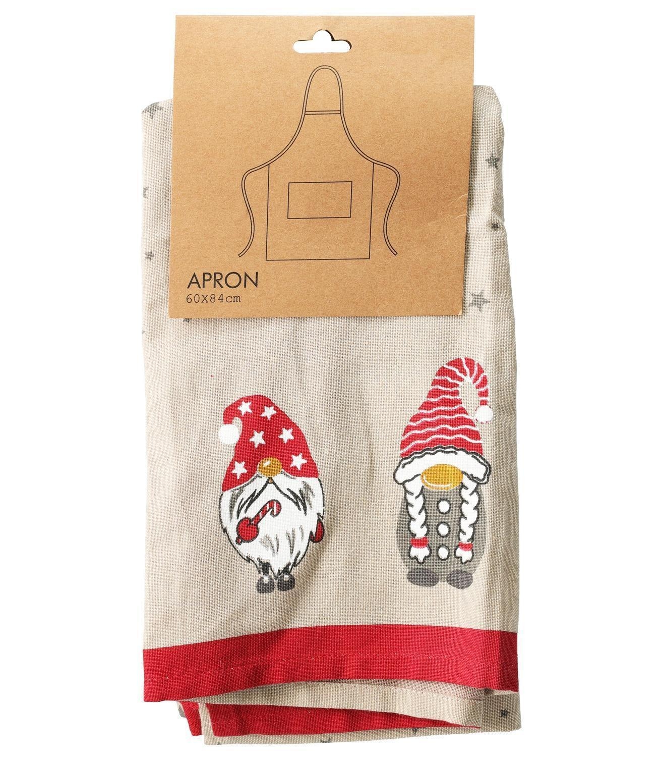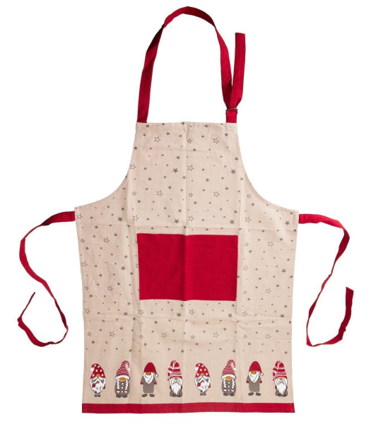 Die Kochschürze CHRISTAS besteht aus Baumwolle in den Farben Beige und Rot und ist mit verschiedenen Weihnachtsmotiven versehen. Sie verfügt über Bindekordeln sowie ein Nackenband und ist auf der Vorderseite mit einer praktischen Tasche ausgestattet. Die Schürze misst 60 cm in der Breite und 84 cm in der Höhe.