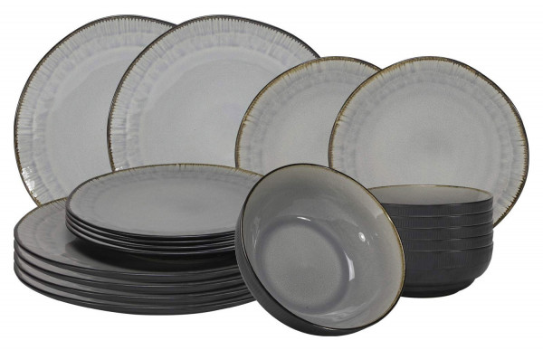 - Kombiservice aus Keramik in hellgrau und schwarz mit Reaktivglasur