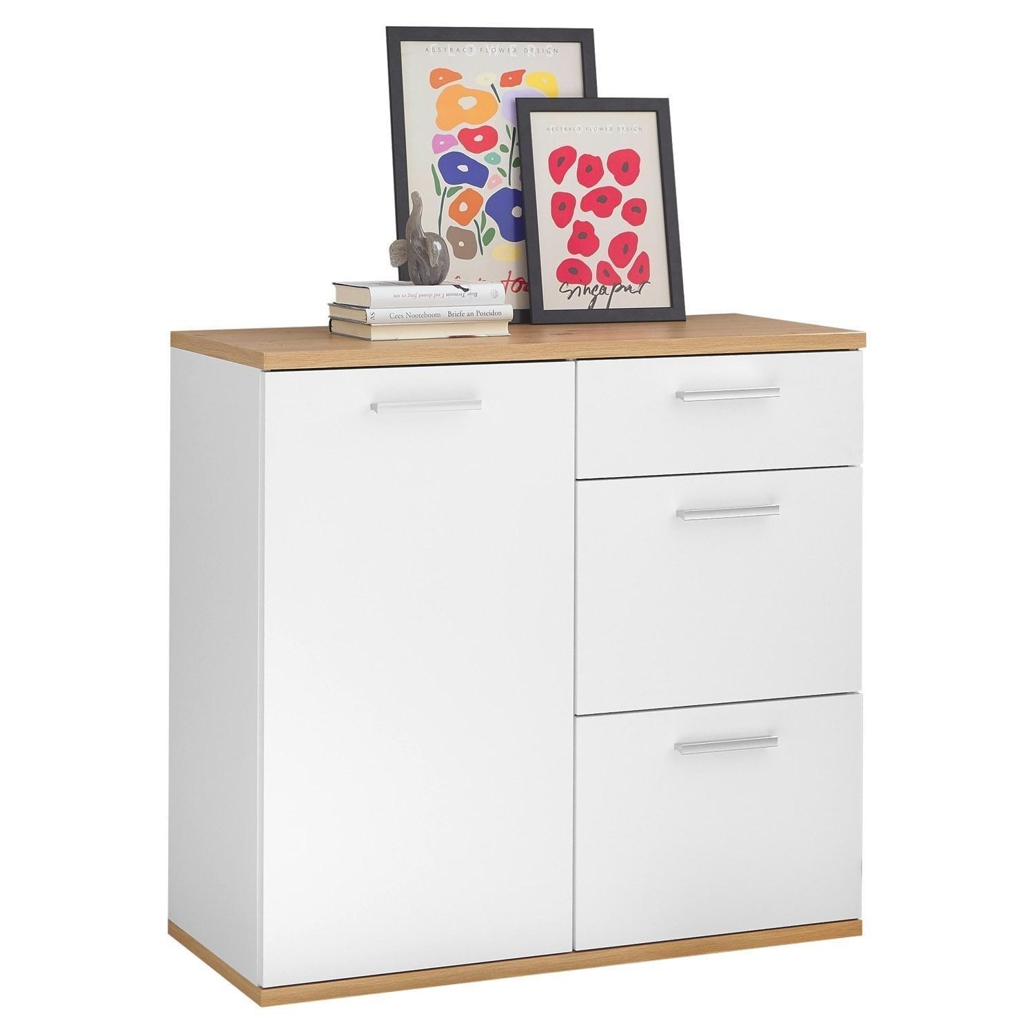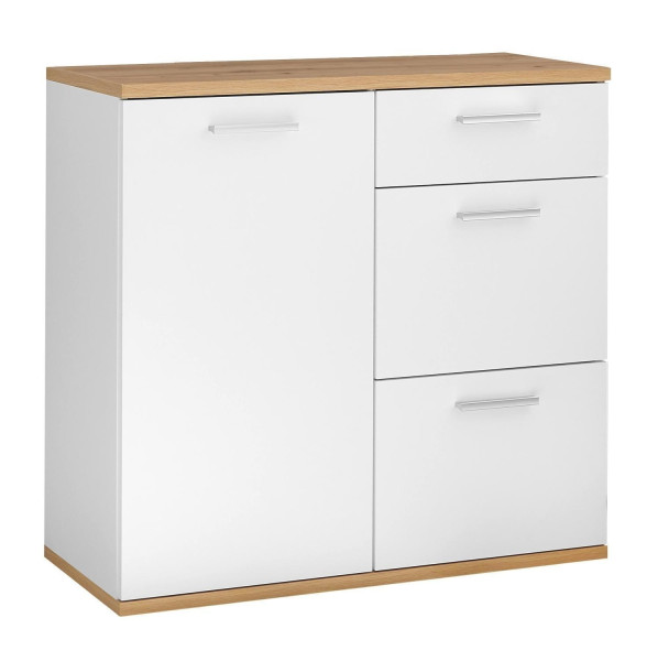 Die 95 cm breite Kommode präsentiert sich in zeitlosem Braun-Weiß mit 1 Tür, 1 höhenverstellbarem Einlegeboden und 3 Schubladen. Mit einer Höhe von 86 cm und einer Tiefe von 38 cm bietet sie nicht nur großzügigen Stauraum, sondern überzeugt auch durch ihr ansprechendes Design in Artisan Eiche Dekor und mattem Weiß. Die Kommode ist mit praktischen Extras wie Einlegeboden, Schubladen und Tür ausgestattet, um Ihren Wohnraum stilvoll zu ergänzen. Das Möbel steht auf 5 kurzen Stellfüßen, die unter der Bodenplatte montiert werden.