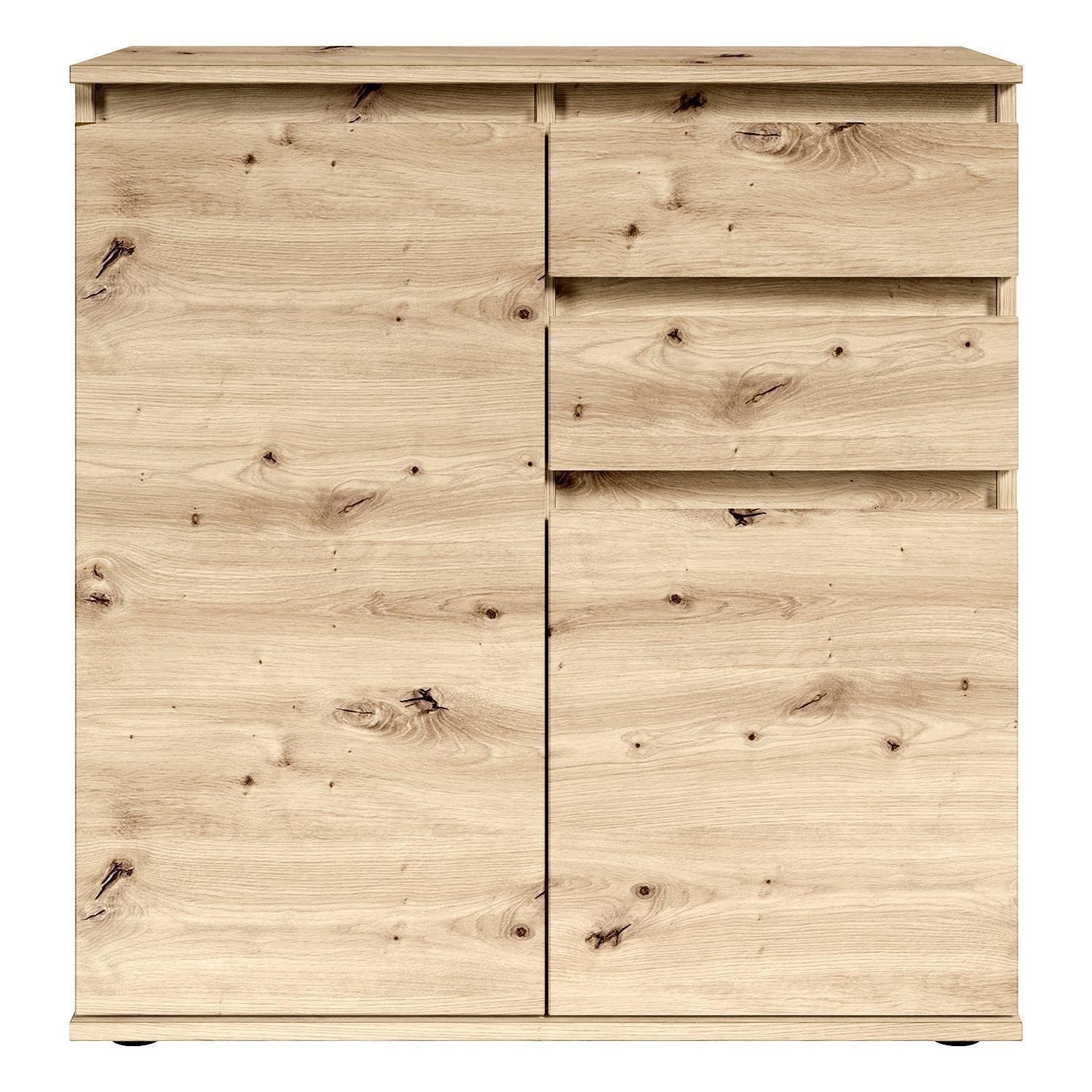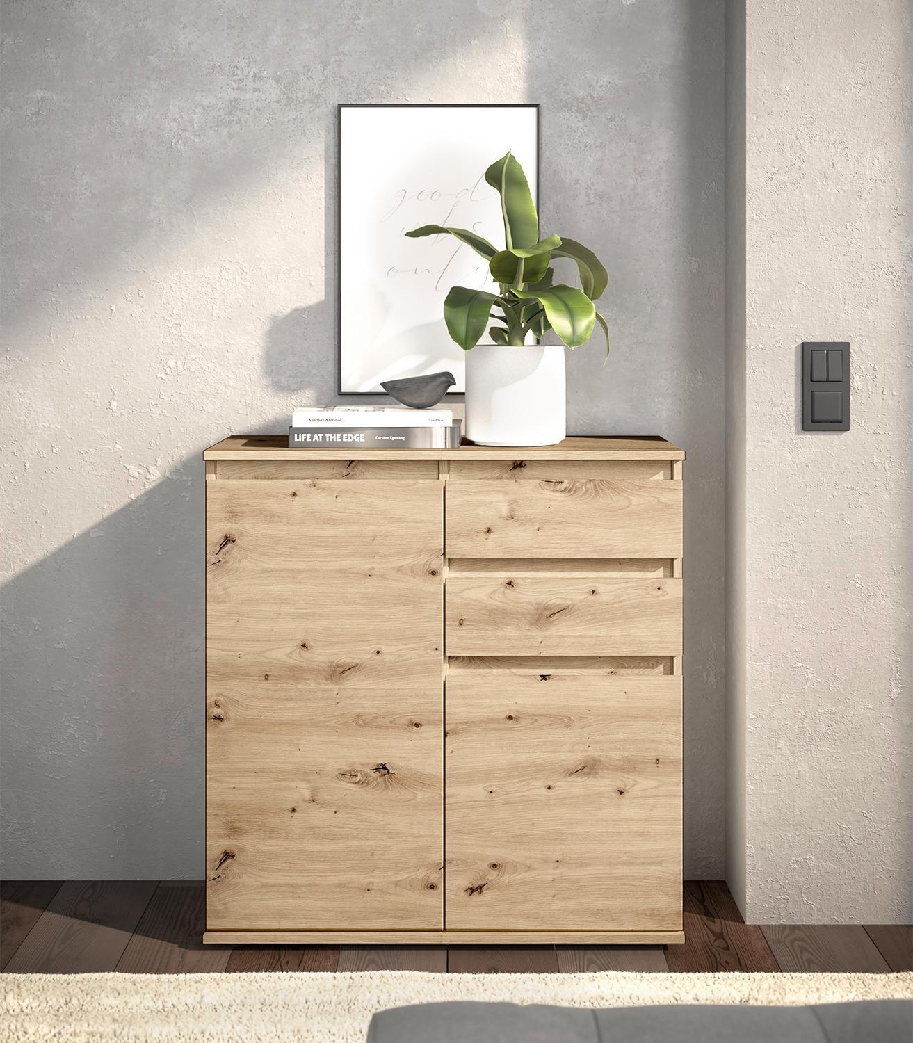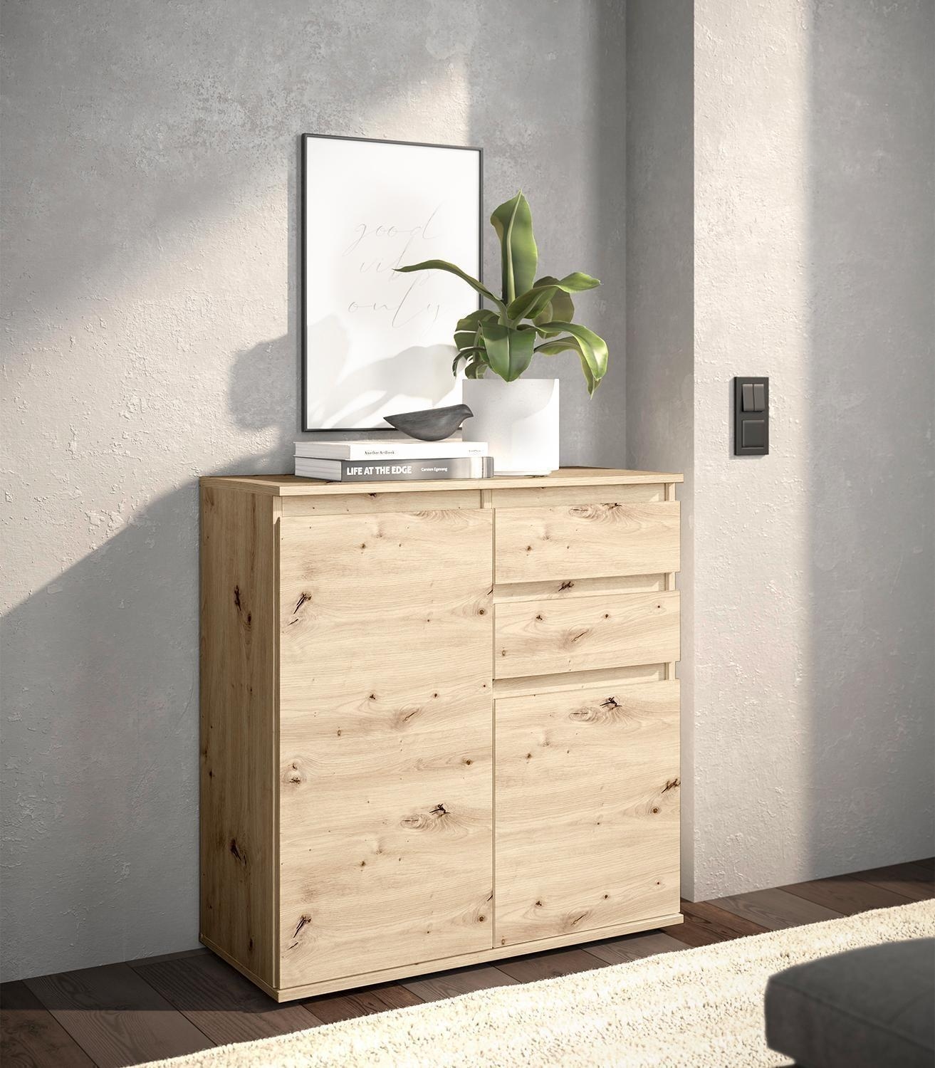 Die Kommode BERKO ist in Artisan Eiche Dekor ausgeführt und verfügt über ein griffloses Design. Sie ist mit zwei Schubladen und zwei Türen ausgestattet, hinter denen sich ein nicht höhenverstellbarer Einlegeboden befindet. Die Kommode hat eine Breite von 80 cm, eine Höhe von 84 cm und eine Tiefe von 35 cm.
