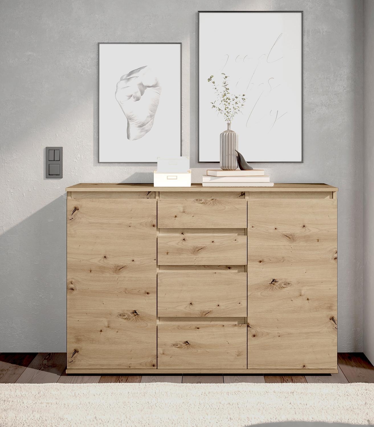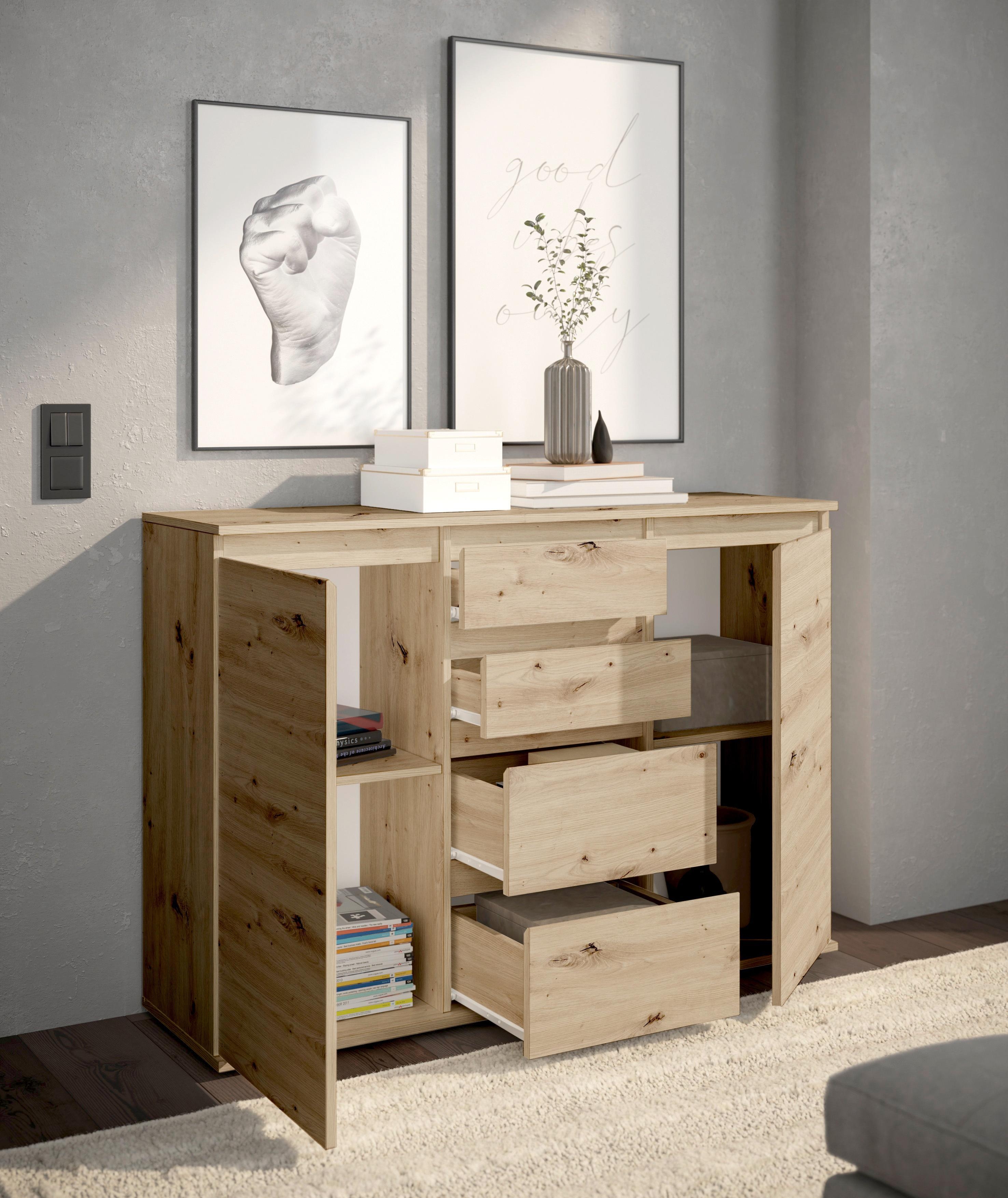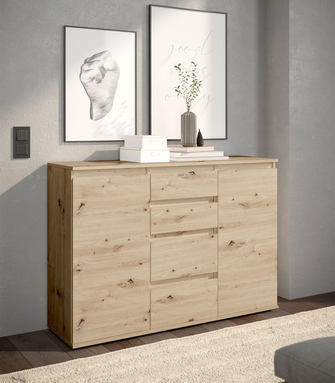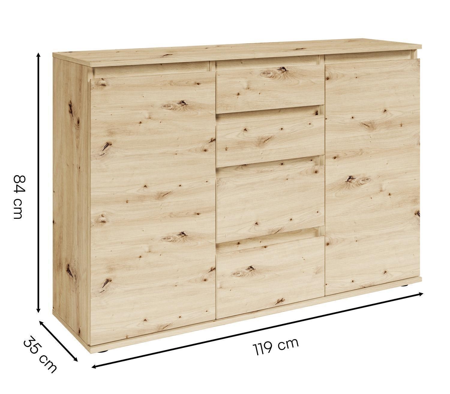 Die Kommode BERKO ist in Artisan Eiche Dekor ausgeführt und verfügt über ein griffloses Design. Sie ist mit vier Schubladen und zwei Türen ausgestattet, hinter denen sich zwei nicht höhenverstellbare Einlegeböden befinden. Die Kommode hat eine Breite von 119 cm, eine Höhe von 84 cm und eine Tiefe von 35 cm.