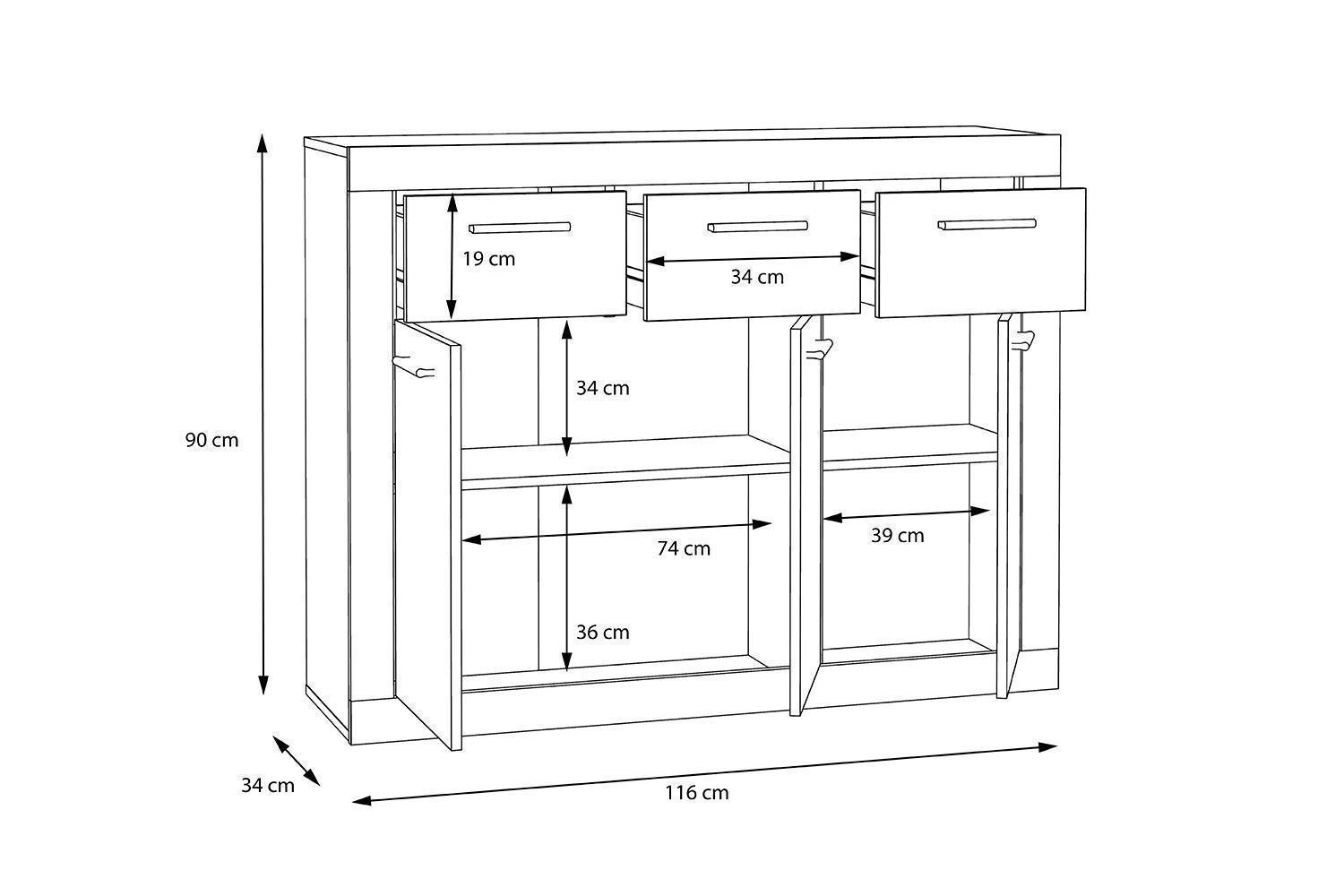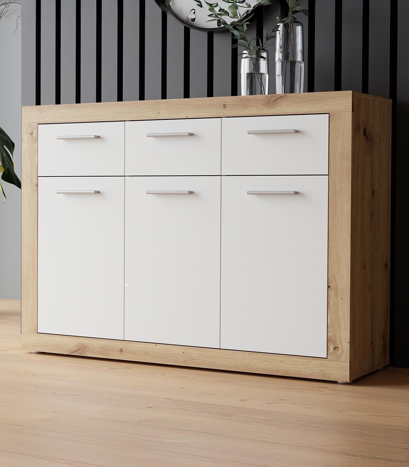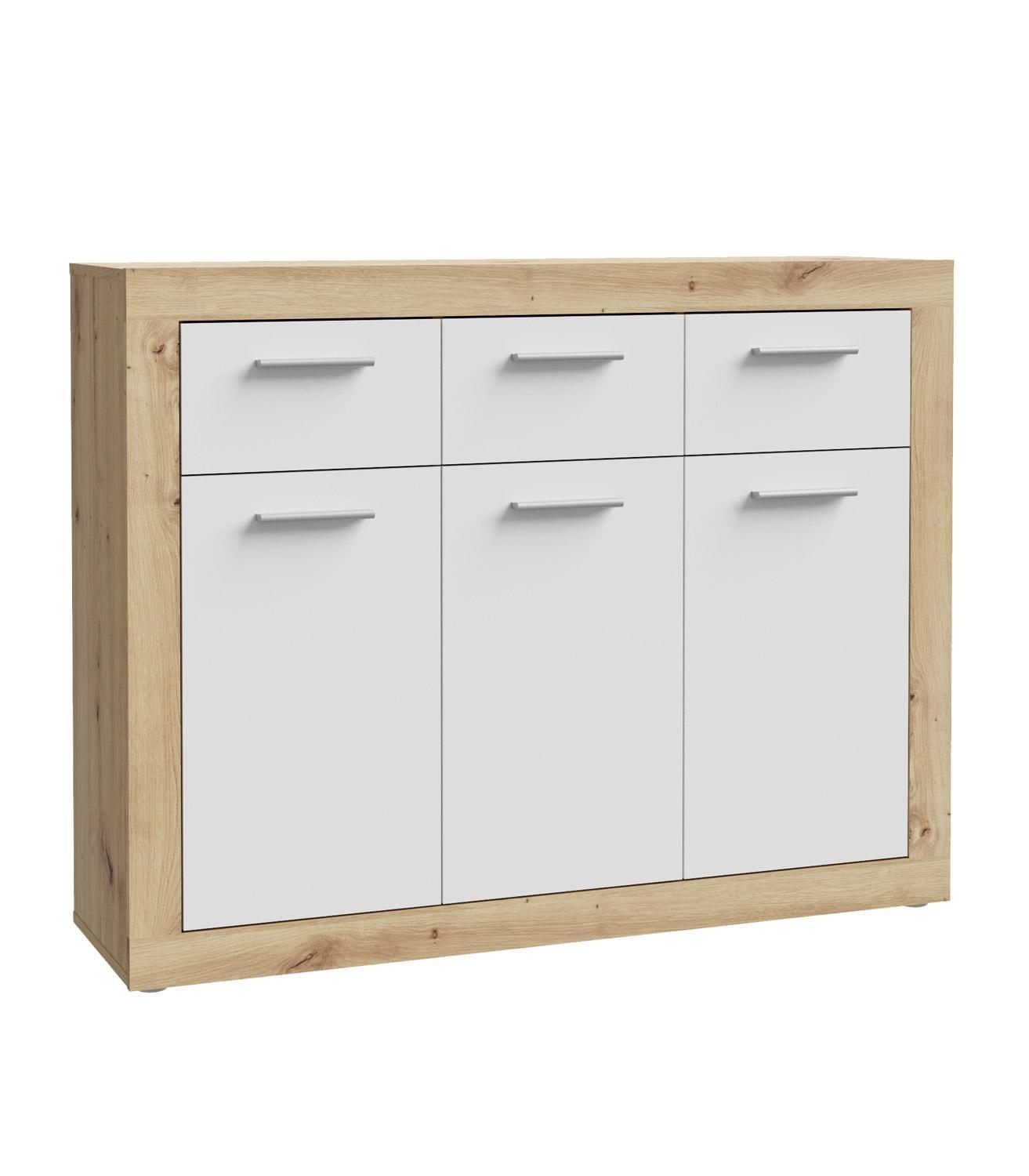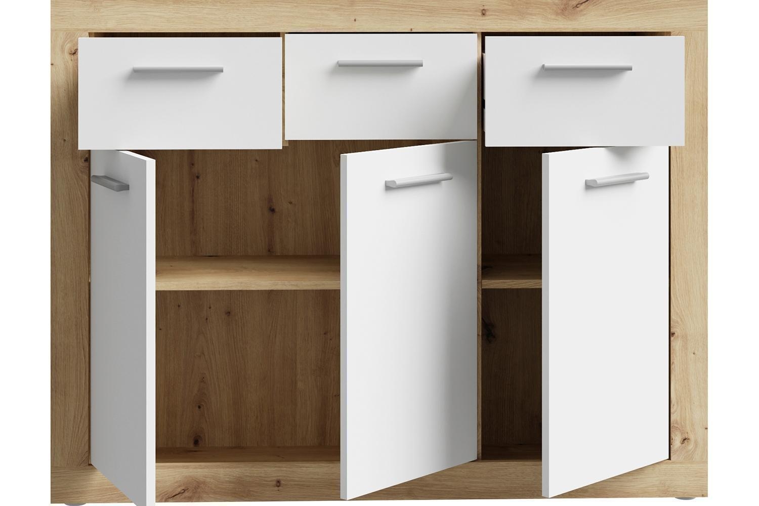118 x 92 cm - 3 Türen - 3 Schubladen - Artisan Eiche Dekor - Weiß matt