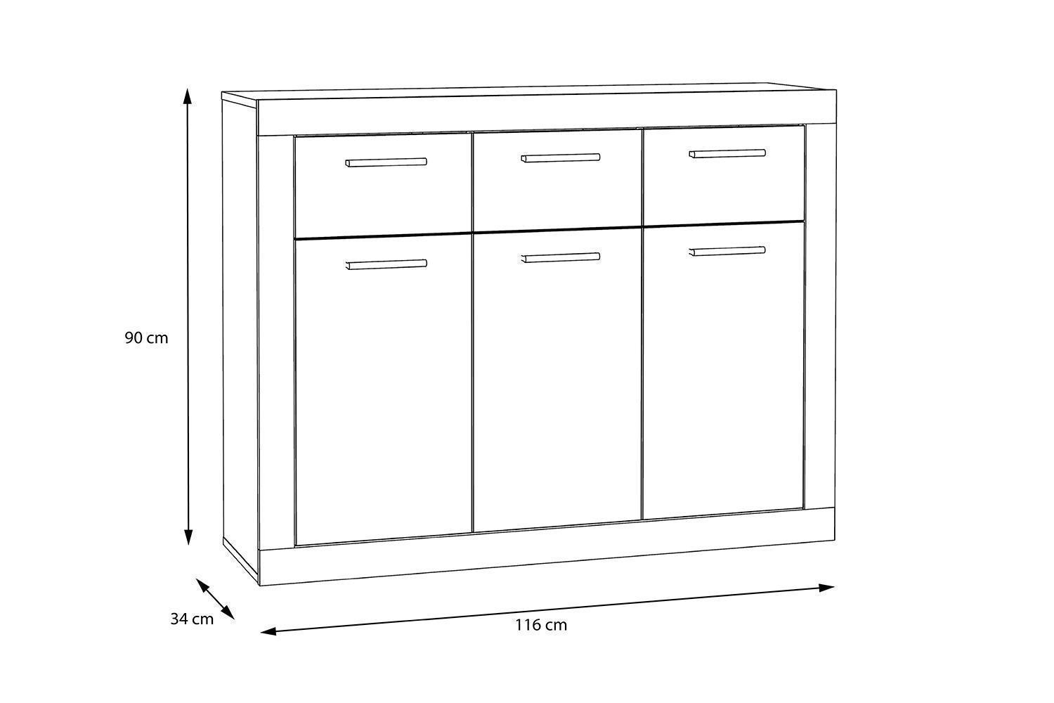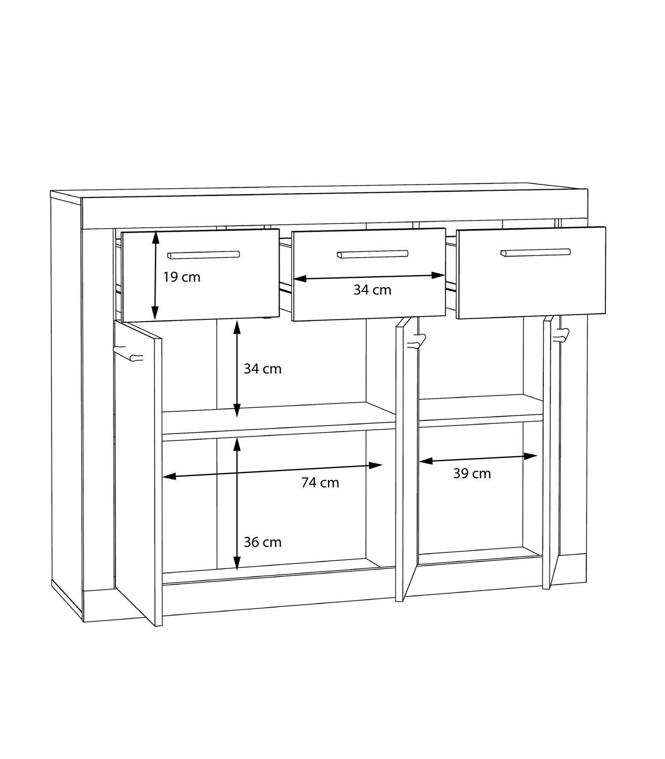 | Lieferumfang: | 1 Kommode mit 3 Türen, 3 Schubladen und 2 mehrfach höhenverstellbaren Einlegeböden |
