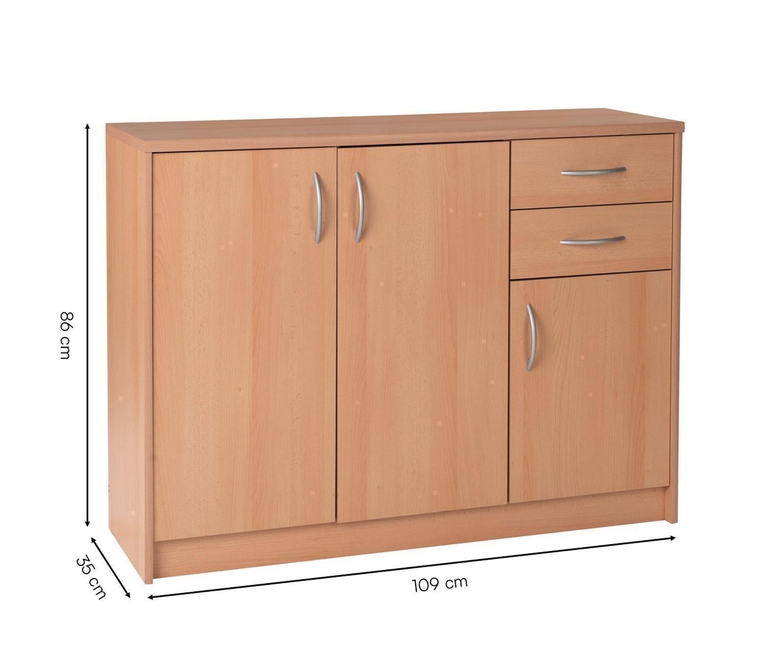 | Lieferumfang: | 1 Kommode mit 3 Türen, 2 Schubladen und 3 höhenverstellbaren Einlegeböden. Alle Böden sind 3-fach in der Höhe verstellbar |