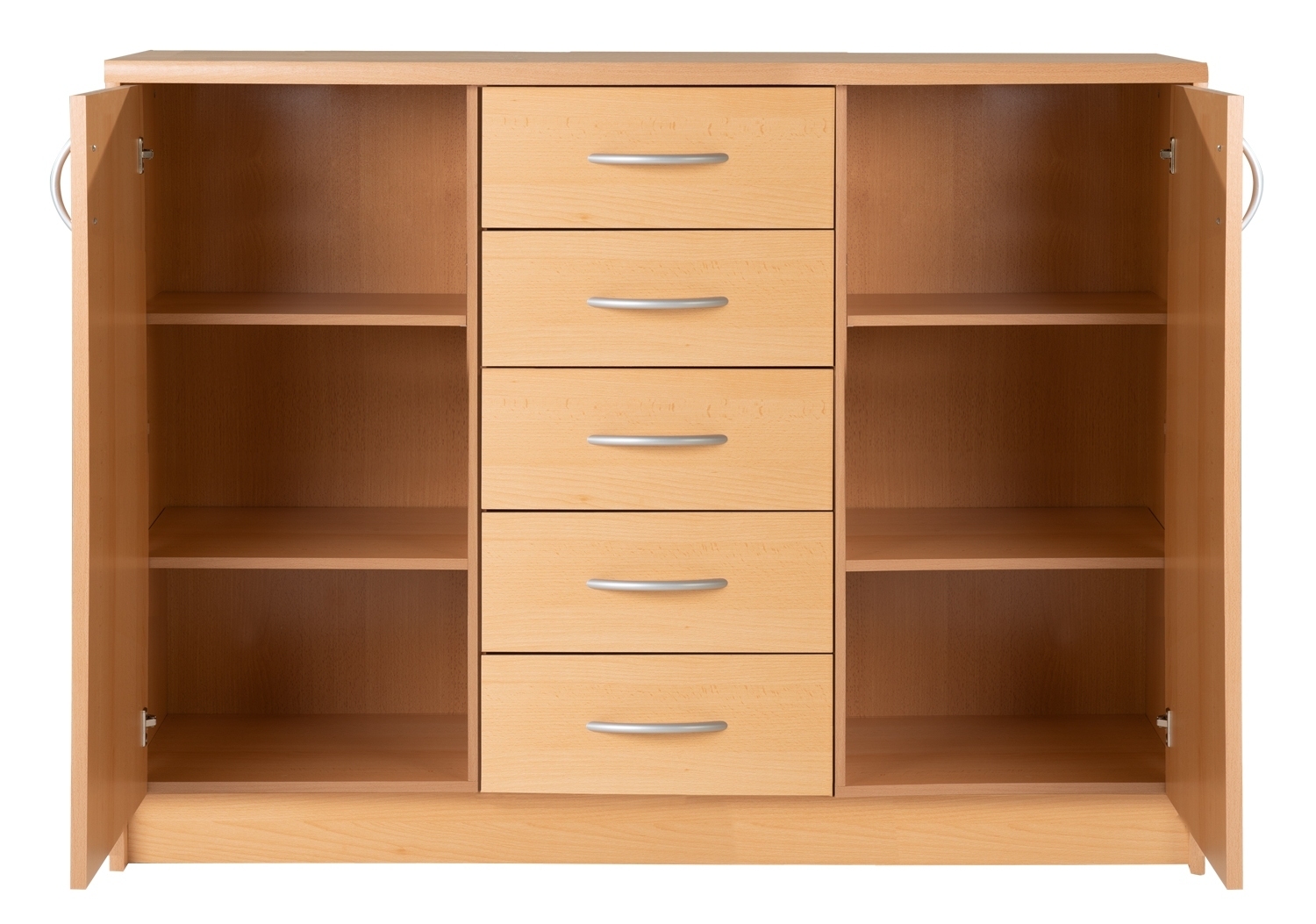 Die Kommode in Buchedekor verfügt über vier 3-fach höhenverstellbare Einlegeböden. Dies ermöglicht eine optimale Anpassung an die jeweiligen Bedürfnisse.