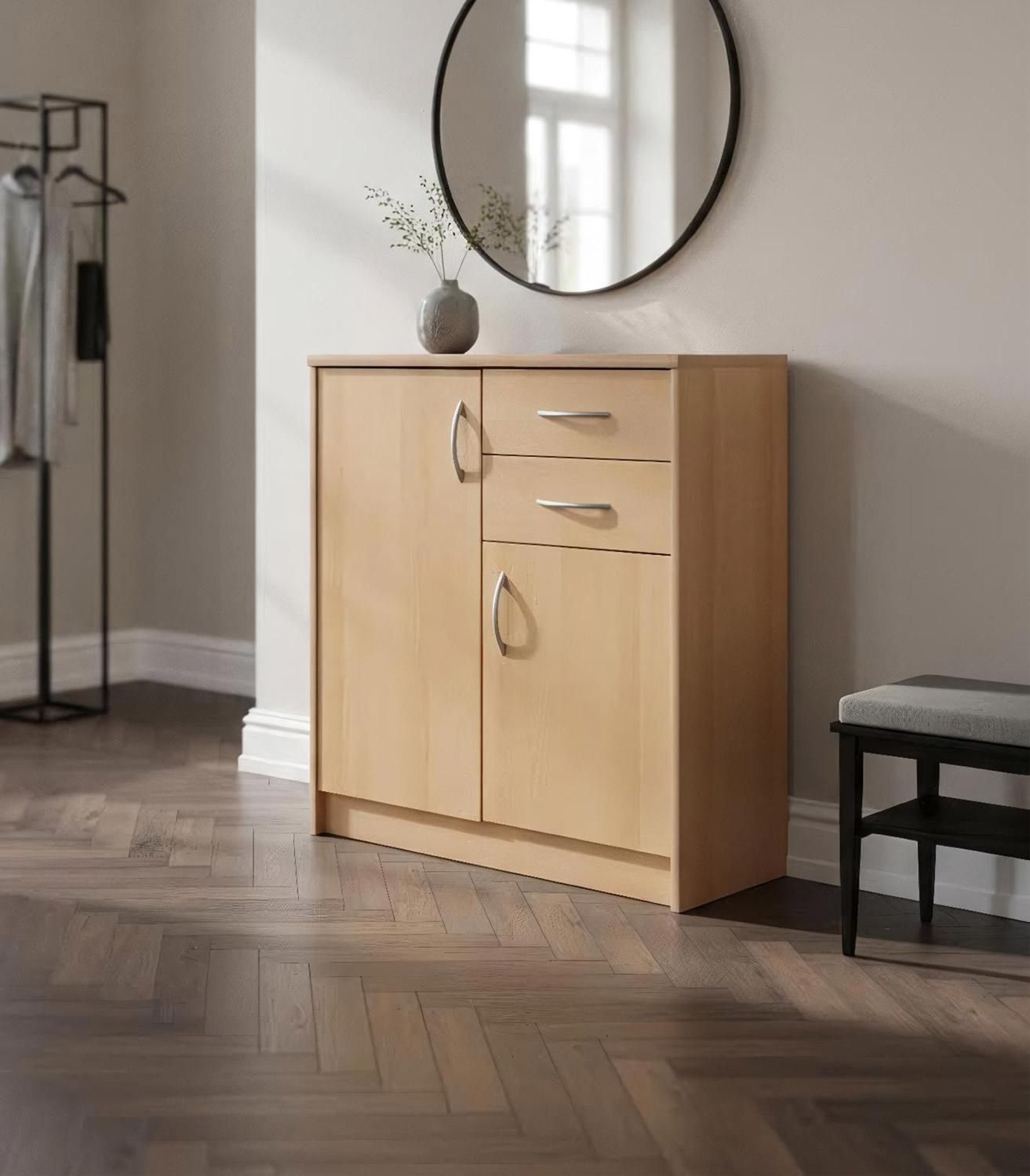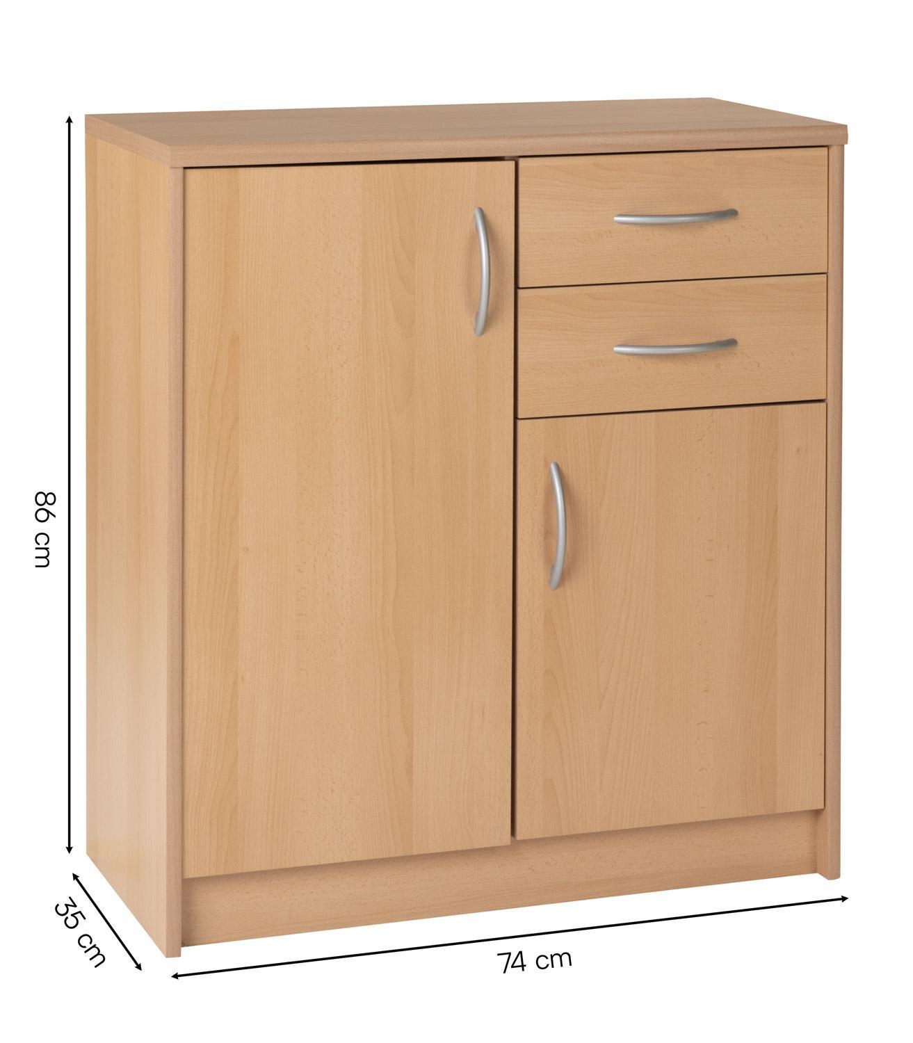 Die Kommode in Buchedekor verfügt über drei 3-fach höhenverstellbare Einlegeböden. Dies ermöglicht eine optimale Anpassung an die jeweiligen Bedürfnisse.