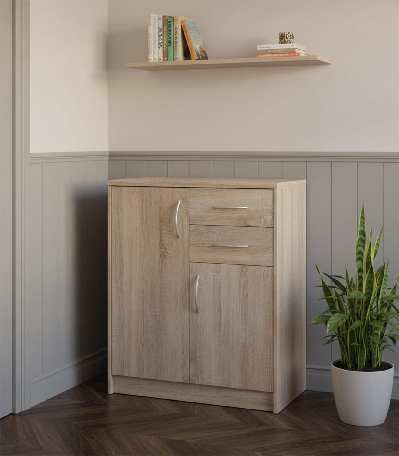 | Lieferumfang: | 1 Kommode mit 2 Türen, 2 Schubladen und 3 höhenverstellbaren Einlegeböden. Alle Böden sind 3-fach in der Höhe verstellbar |