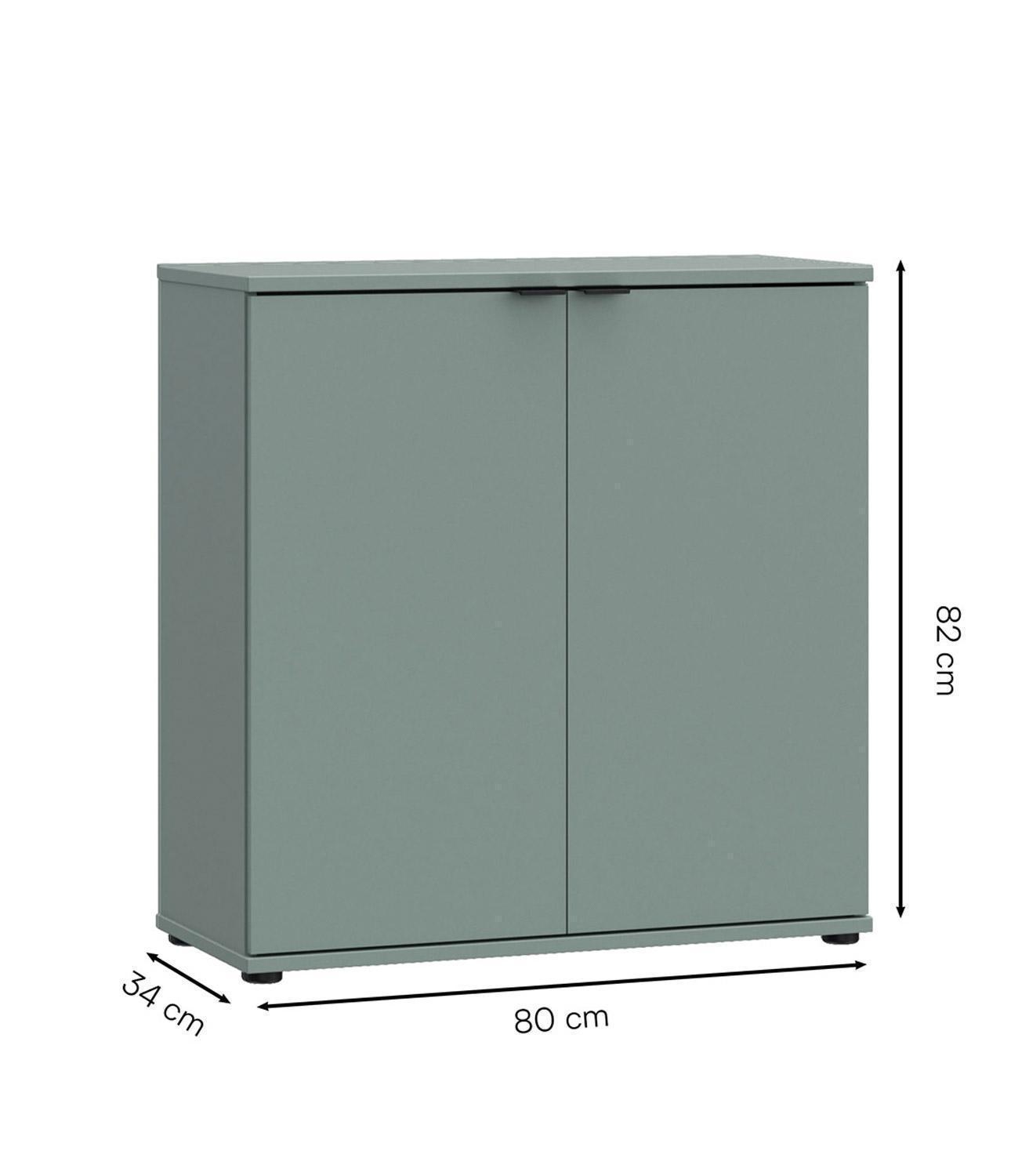 Die Kommode GINGER ist in Salbeigrün matt gehalten und mit schwarzen Metallgriffen ausgestattet. Sie verfügt über zwei Türen, hinter denen sich ein höhenverstellbarer Einlegeboden befindet. Die Maße der Kommode betragen 80 cm in der Breite, 82 cm in der Höhe und 34 cm in der Tiefe.