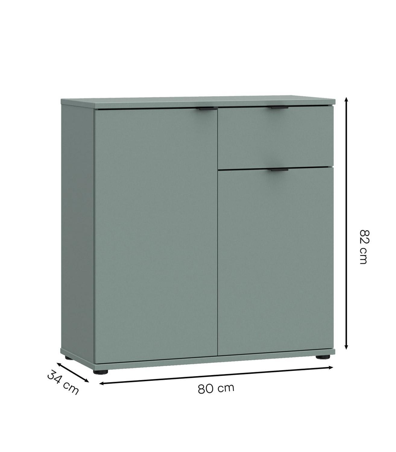 Die Kommode GINGER ist in Salbeigrün matt gehalten und mit schwarzen Metallgriffen ausgestattet. Sie verfügt über zwei Türen, hinter denen sich ein höhenverstellbarer Einlegeboden befindet und eine Schublade. Die Maße der Kommode betragen 80 cm in der Breite, 82 cm in der Höhe und 34 cm in der Tiefe.