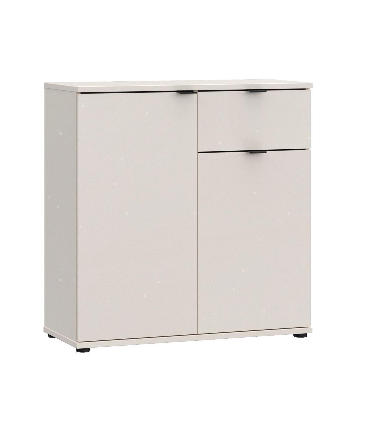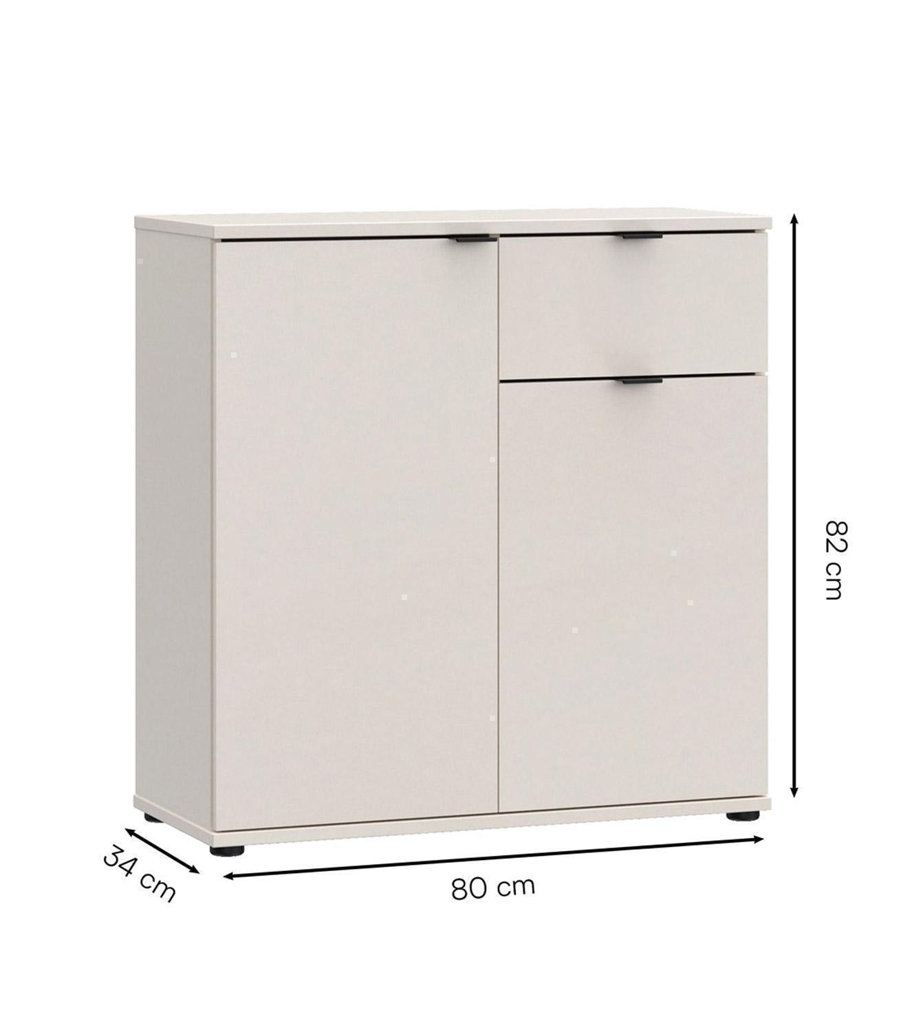 Die Kommode GINGER ist in Sandfarben gehalten und mit schwarzen Metallgriffen ausgestattet. Sie verfügt über zwei Türen, hinter denen sich ein höhenverstellbarer Einlegeboden befindet und eine Schublade. Die Maße der Kommode betragen 80 cm in der Breite, 82 cm in der Höhe und 34 cm in der Tiefe.